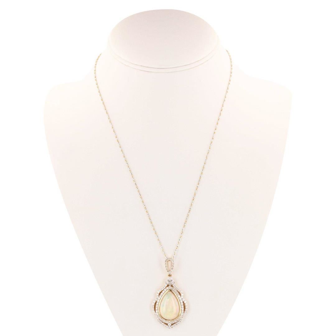 One electronically tested 14KT yellow gold ladies cast & assembled opal and diamond ;pendant with chain. Condition is new, good workmanship. The pendant features an opal cabochon set within stylized diamond bezels, completed by a diamond set bail. The pendant is supported by a twenty inch length 14KT yellow gold designer style chain with rhodium accents, terminating in a lobster claw clasp. Bright polish finish with rhodium accents. Trademark is A. I. Identified with markings of "14K". Containing: ; One bezel set pear cabochon cut natural ethiopian opal, measuring 20.00 x 14.00 x 6.25mm, approximate weight of 8.06ct. The opal has a bright, red multicolor play of color (fire) in a harlequin pattern; a medium dome; a good cut; no inclusions; minor dull spot in its brightness and pattern; and is not directional. Graded in the setting. ; Eighty-seven prong set round brilliant cut diamonds approximate total weight of 87 Stones = 2.15ct. Graded in the setting. ; Clarity I-1 to 1-2 Color G - I ; Total Weight of Colored Stones 8.06ct. Total Weight of Diamonds 2.15ct. Total Weight of Pendant With Chain 15.24 g