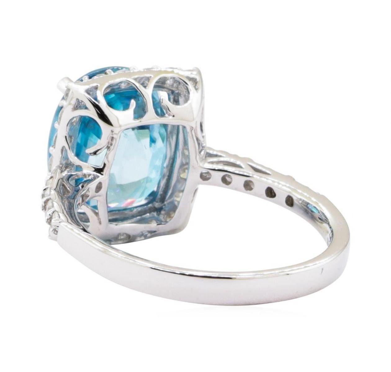 One polished, stamped, and tested 14 karat white gold ling with a bright ?nish. The ring is mounted with: I genuine blue zircon center stone weighing approximately 8.07 carat, and 32 genuine round diamonds weighing approximately 0.60 carats. This item weighs 4.4 grams, condition is new, excellent workmanship. MIAIN GEMSTONE Species: Zircon Shape: Oval Cutting Style: Modi?ed Brilliant Cut Crown Step Cut Pavilion Measurements: 11 x 8.5 x 7,8 mm Weight: 8.07 carat Color: Blue Cut Grade: Very Good Reactive Index: OTL DR Optic Character: Uniaxial Positive Hardness : 6.5 ADJACENT GEMSTONES ON RING Identity: Natural Diamond Shape: Round Cutting Style: Brilliant Cut Quantity: 32 Diamonds Average Diameter: 1.7 mm Total Weight: 0.60 carats Clarity Grade: I1-I2 Color Grade: H - I Refractive Index: 2.418 Hardness: 10 BLUE ZIRCON WEIGHT: 8.07 ct TOTAL DIAMOND WEIGHT: 0.60 cts WEIGHT OF ITEM: 4.4 grams GOLD CONTENT: 14K White Gold ESTIMATED RETAIL REPLACEMENT VALUE: USD $ 5,835.00
