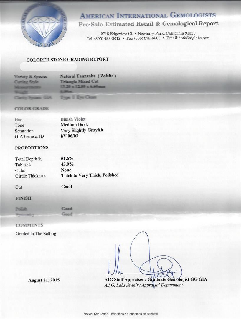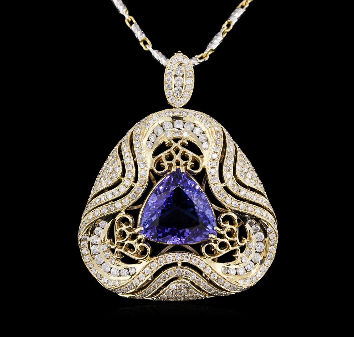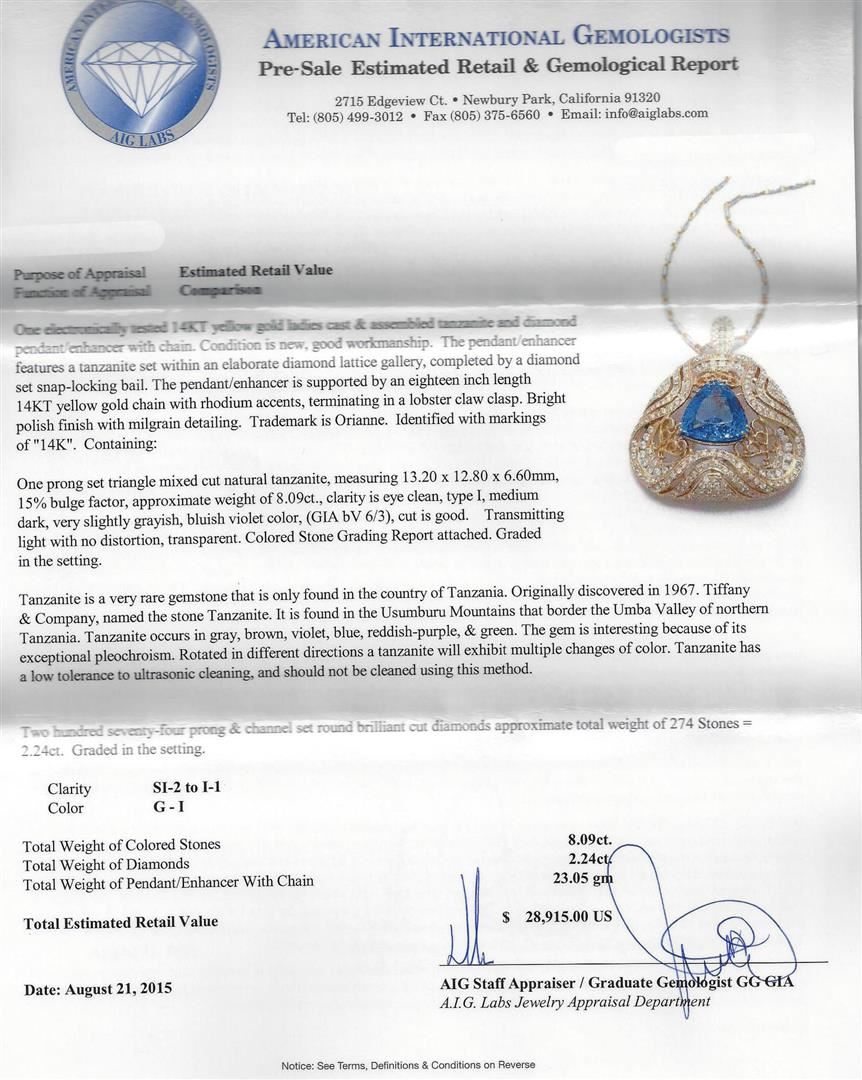 One electronically tested 14KT yellow gold ladies cast & assembled tanzanite and diamond pendant/enhancer with chain. The pendant/enhancer features a tanzanite set within an elaborate diamond lattice gallery, completed by a diamond set snap-locking bail. The pendant/enhancer is supported by an eighteen inch length 14KT yellow gold chain with rhodium accents, terminating in a lobster claw clasp. Bright polish finish with milgrain detailing. Trademark is Orianne. Identified with markings of "14K". Condition is new, good workmanship. Containing: One prong set triangle mixed cut natural tanzanite, measuring 13.20 x 12.80 x 6.60mm, 15%. bulge factor, approximate weight of 8.09ct., clarity is eye clean, type I, medium dark, very slightly grayish, bluish violet color, (GIA bV 6/3), cut is good. Transmitting light with no distortion, transparent. Colored Stone Grading Report attached. Graded in the setting. Tanzanite is a very rare gemstone that is only found in the country of Tanzania. Originally discovered in 1967. Tiffany & Company, named the stone Tanzanite. It is found in the Usumburu Mountains that border the Umba Valley of northern Tanzania. Tanzanite occurs in gray, brown, violet, blue, reddish-purple, & green. The gem is interesting because of its exceptional pleochroism. Rotated in different directions a tanzanite will exhibit multiple changes of color. Tanzanite has a low tolerance to ultrasonic cleaning, and should not be cleaned using this method. Two Hundred Seventy-Four prong & channel set round brilliant cut diamonds approximate total weight of 274 Stones = 2.24ct. Graded in the setting. Clarity: SI-2 to I-1. Color: G - I. Total Weight of Colored Stones 8.09ct. Total Weight of Diamonds 2.24ct. Total Weight of Pendant/Enhancer With Chain 23.05gm. AIG Appraised at $28,915.00.
