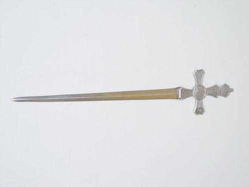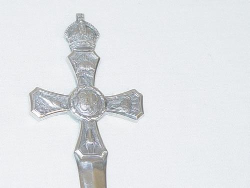 8 1/2" HALLMARKED ENGLISH SILVER LETTER OPENER- ELIZABETHAN DAGGER SHAPE W/ CROWN MOUNTED CROSS HANDLE W/ E.R. II MONOGRAM & FLORA & FAUNA CARTOUCHES OF THE BRITISH EMPIRE - SHEFFIELD, 1853 BY HY. ARCHER & CO. (2 TROY OZ.) - WEAR