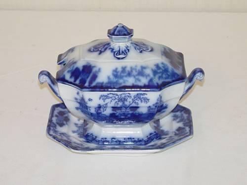 8 1/2" SCINDE FLOW BLUE 3 PC. SAUCE TUREEN BY ALCOCK - MINOR REPAIR & IMPERFECTIONS;