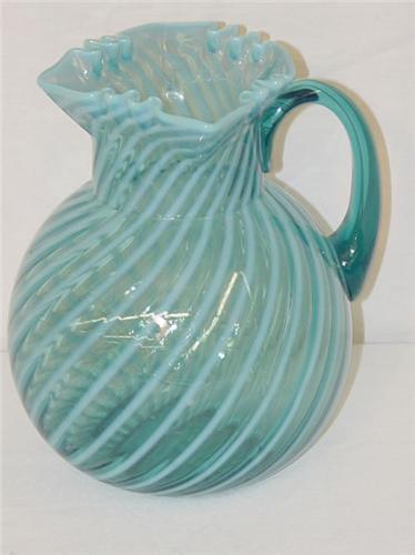 8 1/2" VICTORIAN BLUE OPALESCENT SWIRLED WATER PITCHER W/ APPLIED HANDLE - MINOR SCRATCHES, WEAR