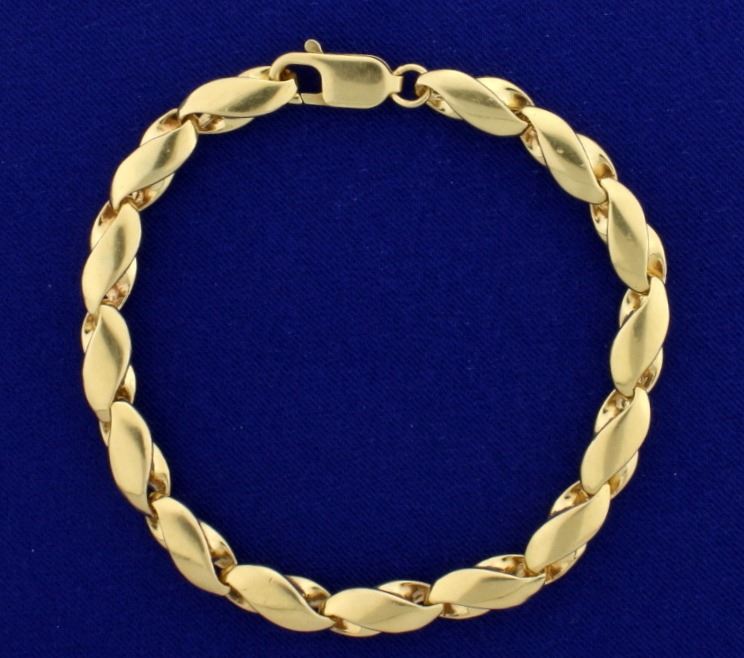 In 14k yellow gold, 8 1/4" long and 6mm wide with lobster clasp. 34.8g.