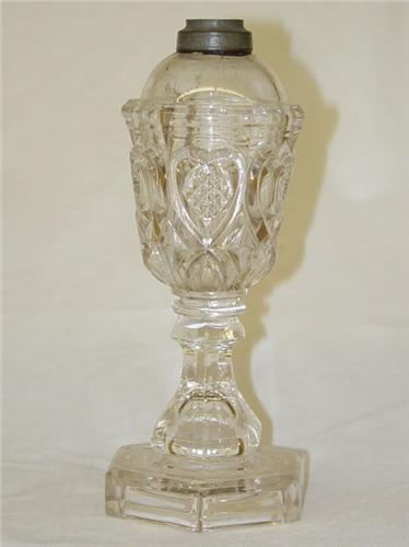 8 1/4" SANDWICH CLEAR OIL LAMP-PRESSED HEART W/ HEXAGONAL BASE - MINOR BASE RIM ROUGHNESS & CONTENT STAINS