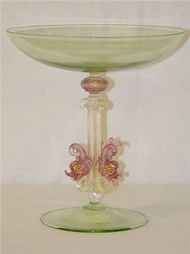 8 1/8" VENETIAN COLORED COMPOTE W/ TRI DOLPHIN STEM - GOLD WEAR and CHIP TO ONE DOLPHIN'S TAIL;