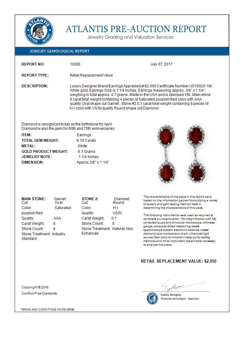 8.10 CTW Garnet & Diamond Earrings 10K White Gold ---- Luxury Designer Brand Earrings Appraised Retail Price at $2,050 ---- SKU Number US10020 10k White gold Earrings Size is 1 1/4 Inches, Earrings measuring approx. 3/8" x 1 1/4", weighing in total approx. 4.7 grams. Made in the USA and is stamped 10k, Main stone 8 carat total weight containing 4 pieces of Saturated purplish Red color with AAA quality Oval shape cut Garnet , Stone #2 0.1 carat total weight containing 8 pieces of H-I color with VS/SI quality Round shape cut