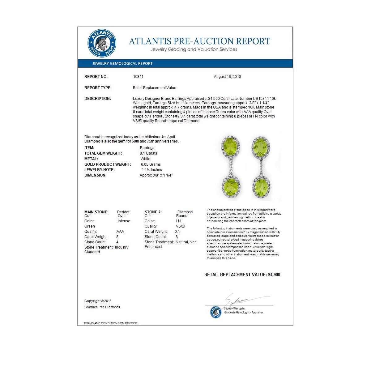 REF-68A2X -10311 ---- 8.10 CTW Peridot & Diamond Earrings 10K White Gold ---- Luxury Designer Brand Earrings Appraised at $4,900 Certificate Number US10311 10k White gold, Earrings Size is 1 1/4 Inches, Earrings measuring approx. 3/8" x 1 1/4", weighing in total approx. 4.7 grams. Made in the USA and is stamped 10k, Main stone 8 carat total weight containing 4 pieces of Intense Green color with AAA quality Oval shape cut Peridot , Stone #2 0.1 carat total weight containing 8 pieces of H-I color with VS/SI quality Round shape cut Diamond