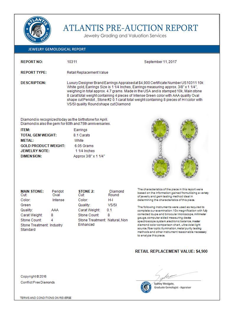 10311 - REF-68R2K ---- 8.10 CTW Peridot & Diamond Earrings 10K White Gold ---- Luxury Designer Brand Earrings Appraised at $4,900 Certificate Number US10311 10k White gold, Earrings Size is 1 1/4 Inches, Earrings measuring approx. 3/8" x 1 1/4", weighing in total approx. 4.7 grams. Made in the USA and is stamped 10k, Main stone 8 carat total weight containing 4 pieces of Intense Green color with AAA quality Oval shape cut Peridot , Stone #2 0.1 carat total weight containing 8 pieces of H-I color with VS/SI quality Round shape cut Diamond