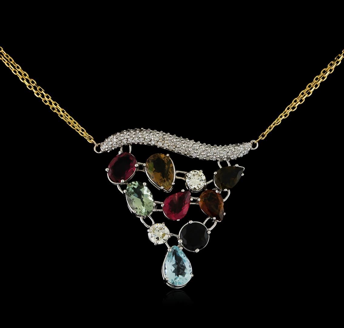 One electronically tested 14KT white and yellow gold lady's combination cast & assembled fashion necklace with a spring ring clasp with a bright polish finish. The featured lady's necklace has a double 1.2mm diamond cut cable link chain measuring approximately 15 inches in length. Identified with markings of "14K". Condition is new, good workmanship. Containing: One prong set pear modified brilliant cut natural aquamarine, measuring 8.90 x 6.16 x 3.80mm, approximate total weight of 1.15ct., clarity is eye clean, type I, medium light, moderately strong, blue color, (GIA B 4/4), cut is good. Transmitting light with no distortion, transparent. Colored gemstones are presumed to have been subjected to commonly used enhancement processes. Graded in the setting. Two prong set round brilliant cut diamonds, measuring 4.60 - 4.50 x 2.65mm (depth est.) approximate total weight of 2 Stones = 0.68ct. Graded in the setting. Clarity: SI-1 to I-1. Color: H - I. Cut Good Seventy-Three prong set round brilliant cut diamonds, measuring 1.30 - 1.20 x 0.78mm (depth est.) approximate total weight of 73 Stones = 0.55ct. Graded in the setting. Clarity: SI-1 to SI-2. Color: G - I. Cut Good One prong set round modified brilliant cut natural green tourmaline, measuring 7.10 - 7.00 x 3.70 mm, approximate weight of 1.15ct., clarity is slightly included, type I, dark, moderately strong, green color, (GIA G 7/4), cut is good. Transmitting light with a minimum of distortion, transparent. Colored gemstones are presumed to have been subjected to commonly used enhancement processes. Graded in the setting. Two prong set oval modified brilliant cut natural multi-color tourmalines, measuring 8.70 x 5.85 x 3.50mm, approximate total weight of 2.30ct., clarity is eye clean, cut is good. The featured tourmalines range in color from light green to medium pink. Transmitting light with no distortion, transparent. Colored gemstones are presumed to have been subjected to commonly used enhancement processes. Graded in the setting. Four prong set pear modified brilliant cut natural multi-color tourmalines, measuring 7.90 x 6.00 x 3.00mm, approximate total weight of 3.50ct., clarity is slightly included, cut is good. The featured tourmalines range in color from brown to yellowish green to green to pink. Transmitting light with a minimum of distortion, transparent. Colored gemstones are presumed to have been subjected to commonly used enhancement processes. Graded in the setting. Total Weight of Colored Stones 8.10ct. Total Weight of Diamonds 1.23ct. Total Weight of Necklace 10.60gm. GAS Appraised at $9,005.00.