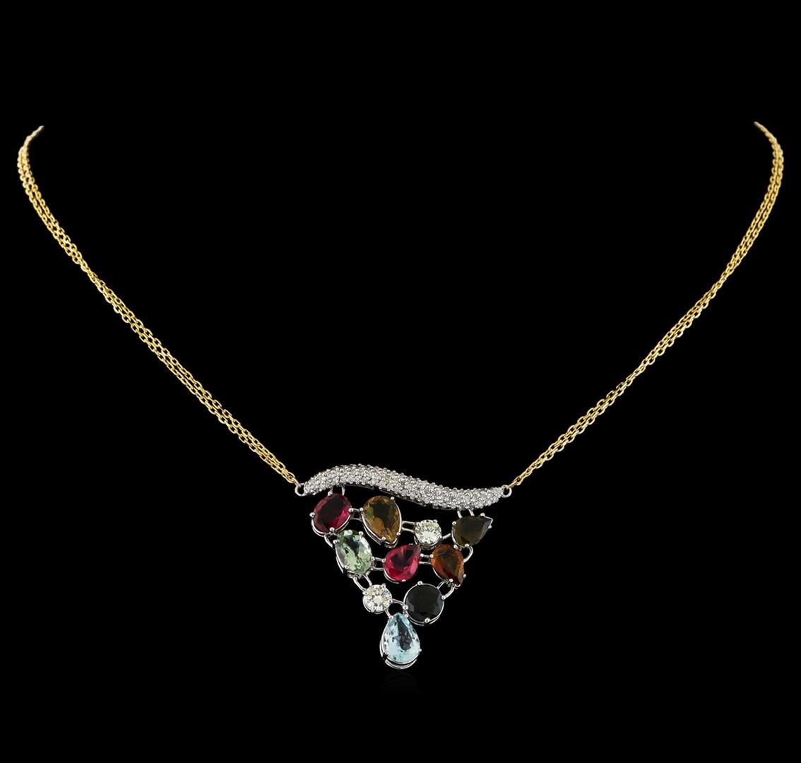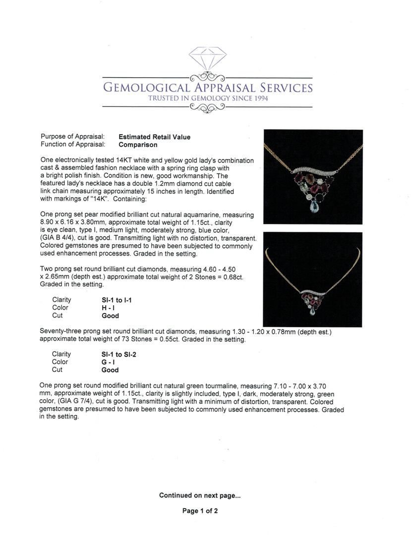 One electronically tested 14KT white and yellow gold lady's combination cast & assembled fashion necklace with a spring ring clasp with a bright polish finish. The featured lady's necklace has a double 1.2mm diamond cut cable link chain measuring approximately 15 inches in length. Identified with markings of "14K". Condition is new, good workmanship. Containing: One prong set pear modified brilliant cut natural aquamarine, measuring 8.90 x 6.16 x 3.80mm, approximate total weight of 1.15ct., clarity is eye clean, type I, medium light, moderately strong, blue color, (GIA B 4/4), cut is good. Transmitting light with no distortion, transparent. Colored gemstones are presumed to have been subjected to commonly used enhancement processes. Graded in the setting. Two prong set round brilliant cut diamonds, measuring 4.60 - 4.50 x 2.65mm (depth est.) approximate total weight of 2 Stones = 0.68ct. Graded in the setting. Clarity: SI-1 to I-1. Color: H - I. Cut Good Seventy-Three prong set round brilliant cut diamonds, measuring 1.30 - 1.20 x 0.78mm (depth est.) approximate total weight of 73 Stones = 0.55ct. Graded in the setting. Clarity: SI-1 to SI-2. Color: G - I. Cut Good One prong set round modified brilliant cut natural green tourmaline, measuring 7.10 - 7.00 x 3.70 mm, approximate weight of 1.15ct., clarity is slightly included, type I, dark, moderately strong, green color, (GIA G 7/4), cut is good. Transmitting light with a minimum of distortion, transparent. Colored gemstones are presumed to have been subjected to commonly used enhancement processes. Graded in the setting. Two prong set oval modified brilliant cut natural multi-color tourmalines, measuring 8.70 x 5.85 x 3.50mm, approximate total weight of 2.30ct., clarity is eye clean, cut is good. The featured tourmalines range in color from light green to medium pink. Transmitting light with no distortion, transparent. Colored gemstones are presumed to have been subjected to commonly used enhancement processes. Graded in the setting. Four prong set pear modified brilliant cut natural multi-color tourmalines, measuring 7.90 x 6.00 x 3.00mm, approximate total weight of 3.50ct., clarity is slightly included, cut is good. The featured tourmalines range in color from brown to yellowish green to green to pink. Transmitting light with a minimum of distortion, transparent. Colored gemstones are presumed to have been subjected to commonly used enhancement processes. Graded in the setting. Total Weight of Colored Stones 8.10ct. Total Weight of Diamonds 1.23ct. Total Weight of Necklace 10.60gm. GAS Appraised at $9,005.00.
