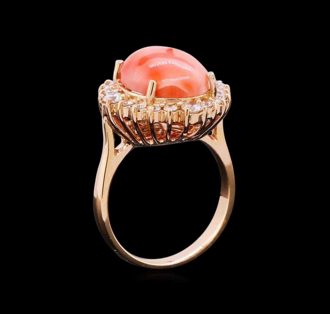 One electronically tested 14KT rose gold lady's cast fashion ring with a basket halo with a bright polish finish. The featured lady's ring has a shank measuring 2.85 millimeters in width. Identified with markings of "K14". Condition is new, good workmanship. Containing: One prong set oval cabochon cut natural pink coral, measuring 14.84 x 10.85 x 4.83mm, (depth est.) 20%. bulge factor, approximate weight of 8.10 ct., orangy red color, (GIA oR 0/0), cut is good. The featured pink coral has a marbled pink and red appearance. Transmitting light diffusely, opaque to translucent. Colored gemstones are presumed to have been subjected to commonly used enhancement processes. Graded in the setting. Sixteen prong set round brilliant cut diamonds, measuring 2.10 - 2.00 x 1.29mm (depth est.) approximate total weight of 16 Stones = 0.58ct. Graded in the setting. Clarity: SI-1 to SI-2. Color: H - I. Cut Good Four prong set round brilliant cut diamonds, measuring 2.80 - 2.70 x 1.71mm (depth est.) approximate total weight of 4 Stones = 0.31ct. Graded in the setting. Clarity: VS-2 to SI-1. Color: H - I. Cut Very Good. Total Weight of Colored Stones 8.10 ct. Total Weight of Diamonds 0.89ct. Total Weight of Ring 7.40gm. GAS Appraised.