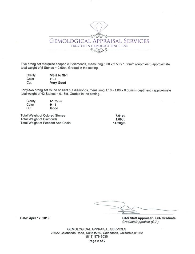 One electronically tested 18KT white gold lady's combination cast & assembled fashion pendant and chain 20.0' long, 1.4mm round cable link with a lobster claw clasp with a bright polish finish. The featured lady's pendant has an attached double strand chain with six attached bezel set diamonds. Identified with markings of '18K'. Condition is like new, good workmanship. Containing: One prong set round modified mixed cut natural tanzanite, measuring 9.15 - 9.11 x 5.44 mm, (depth est.) 5%. bulge factor, approximate weight of 3.20ct., clarity is eye clean, light, very slightly grayish, blue color, (GIA B 3/3), cut is very good. Transmitting light with no distortion, transparent. Colored gemstones are presumed to have been subjected to commonly used enhancement processes. Graded in the setting. One prong set pear modified mixed cut natural tanzanite, measuring 10.00 x 8.88 x 6.10mm, (depth est.) 5%. bulge factor, approximate weight of 3.81ct., clarity is eye clean, light, very slightly grayish, blue color, (GIA B 3/3), cut is good. Transmitting light with no distortion, transparent. Colored gemstones are presumed to have been subjected to commonly used enhancement processes. Graded in the setting. One prong set round brilliant cut diamond, measuring 3.10 - 3.05 x 1.93mm (depth est.) approximate weight of 0.11ct. Graded in the setting. Color H Clarity SI-1 Cut Good Six prong set round brilliant cut diamonds, measuring 2.10 - 2.00 x 1.27mm (depth est.) approximate total weight of 6 Stones = 0.20ct. Graded in the setting. Color G - H Clarity SI-1 to SI-2 Cut Very Good Five prong set marquise shaped cut diamonds, measuring 5.00 x 2.50 x 1.58mm (depth est.) approximate total weight of 5 Stones = 0.60ct. Graded in the setting. Color H - I Clarity VS-2 to SI-1 Cut Very Good Forty-Two prong set round brilliant cut diamonds, measuring 1.10 - 1.00 x 0.65mm (depth est.) approximate total weight of 42 Stones = 0.18ct. Graded in the setting. Color H - I Clarity I-1 to I-2 Cut Good. Total Weight of Colored Stones 7.01ct.. Total Weight of Diamonds 1.09ct.. Total Weight of Pendant And Chain 14.20gm GAS Appraised at $10525.00. GAS Appraised at $10,525.00.