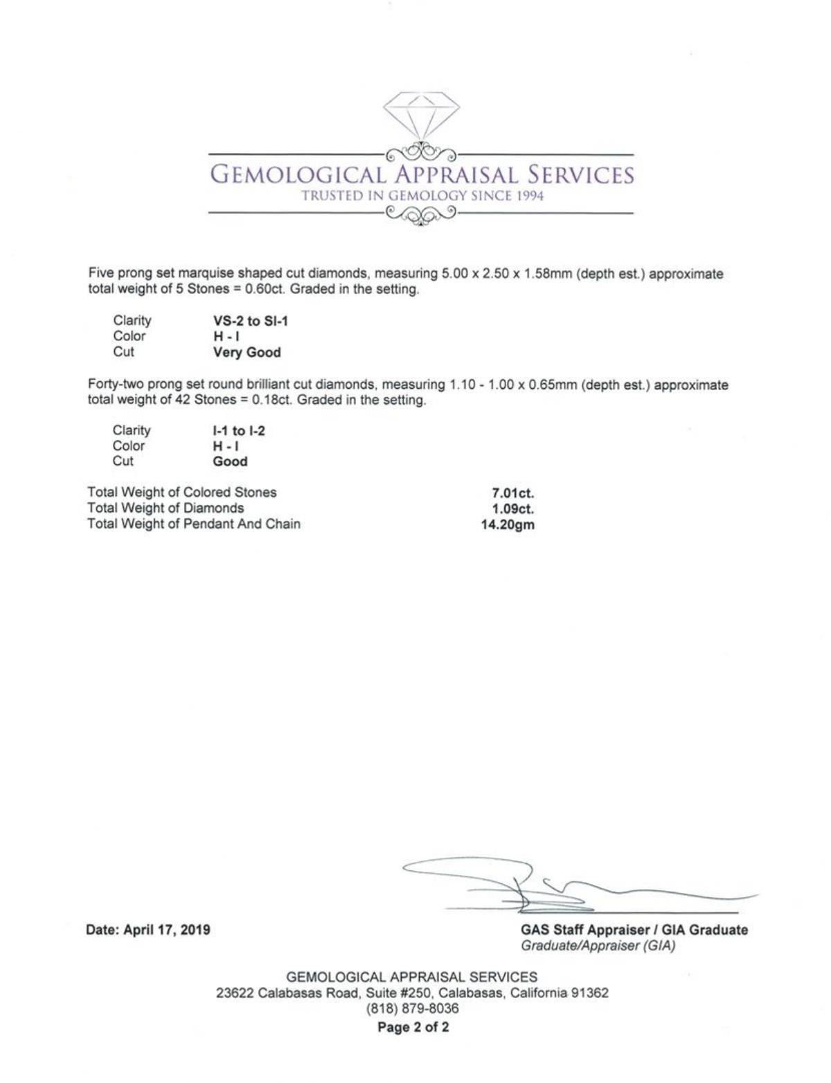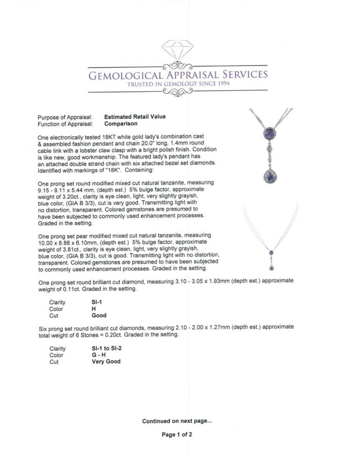 One electronically tested 18KT white gold lady's combination cast & assembled fashion pendant and chain 20.0' long, 1.4mm round cable link with a lobster claw clasp with a bright polish finish. The featured lady's pendant has an attached double strand chain with six attached bezel set diamonds. Identified with markings of '18K'. Condition is like new, good workmanship. Containing: One prong set round modified mixed cut natural tanzanite, measuring 9.15 - 9.11 x 5.44 mm, (depth est.) 5%. bulge factor, approximate weight of 3.20ct., clarity is eye clean, light, very slightly grayish, blue color, (GIA B 3/3), cut is very good. Transmitting light with no distortion, transparent. Colored gemstones are presumed to have been subjected to commonly used enhancement processes. Graded in the setting. One prong set pear modified mixed cut natural tanzanite, measuring 10.00 x 8.88 x 6.10mm, (depth est.) 5%. bulge factor, approximate weight of 3.81ct., clarity is eye clean, light, very slightly grayish, blue color, (GIA B 3/3), cut is good. Transmitting light with no distortion, transparent. Colored gemstones are presumed to have been subjected to commonly used enhancement processes. Graded in the setting. One prong set round brilliant cut diamond, measuring 3.10 - 3.05 x 1.93mm (depth est.) approximate weight of 0.11ct. Graded in the setting. Color H Clarity SI-1 Cut Good Six prong set round brilliant cut diamonds, measuring 2.10 - 2.00 x 1.27mm (depth est.) approximate total weight of 6 Stones = 0.20ct. Graded in the setting. Color G - H Clarity SI-1 to SI-2 Cut Very Good Five prong set marquise shaped cut diamonds, measuring 5.00 x 2.50 x 1.58mm (depth est.) approximate total weight of 5 Stones = 0.60ct. Graded in the setting. Color H - I Clarity VS-2 to SI-1 Cut Very Good Forty-Two prong set round brilliant cut diamonds, measuring 1.10 - 1.00 x 0.65mm (depth est.) approximate total weight of 42 Stones = 0.18ct. Graded in the setting. Color H - I Clarity I-1 to I-2 Cut Good. Total Weight of Colored Stones 7.01ct.. Total Weight of Diamonds 1.09ct.. Total Weight of Pendant And Chain 14.20gm GAS Appraised at $10525.00. GAS Appraised.