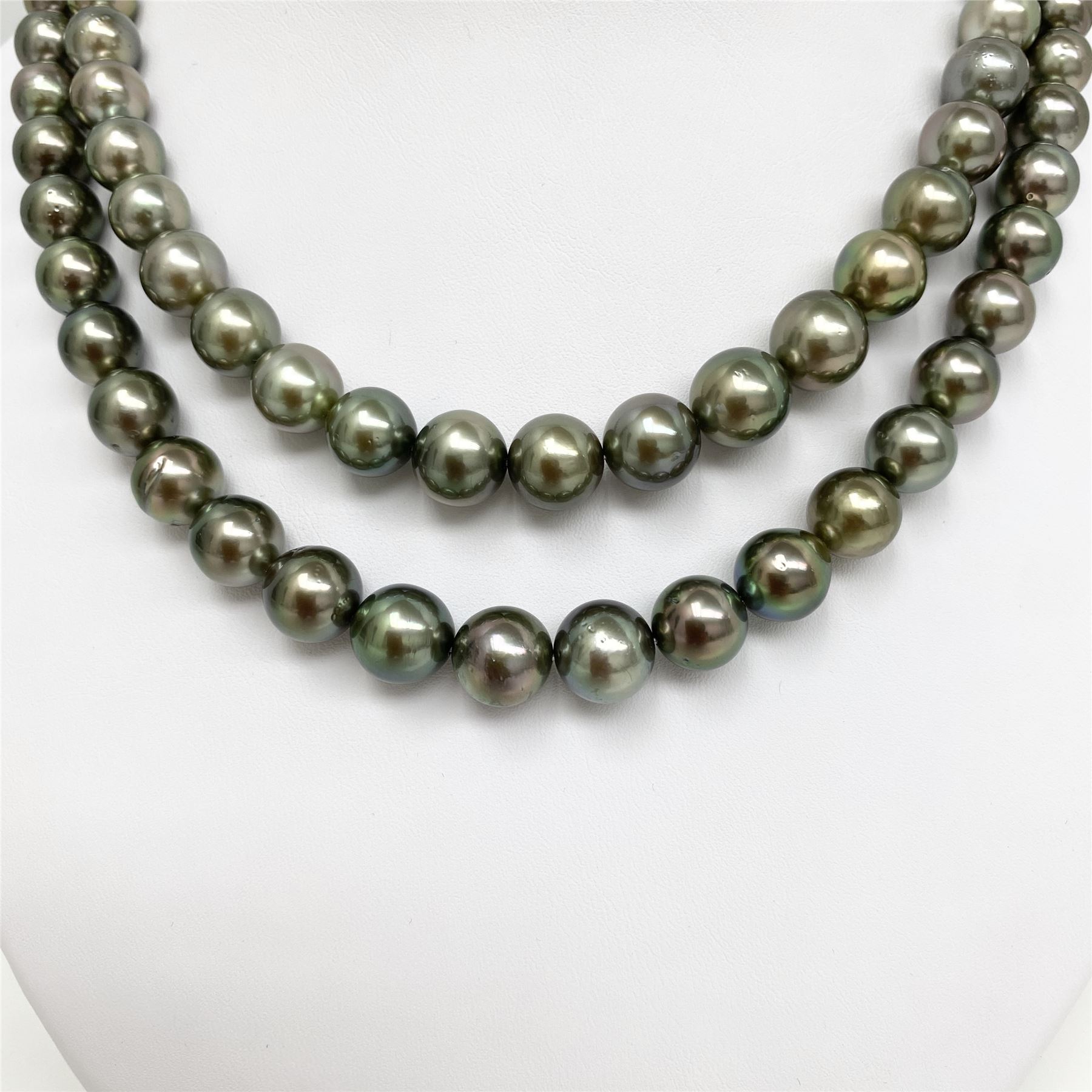 AAA Quality, Tahitian Pistachio Green Near-Round Double-Strand Pearl Necklace, 36 inches hand-knotted with gold fish-hook clasp #CP98