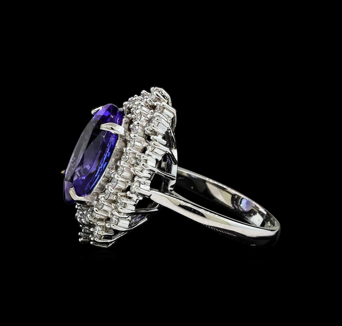 One electronically tested 14KT white gold lady's cast fashion ring with a double basket halo with a bright polish finish. The featured lady's ring has a shank measuring 2.90 millimeters wide. Identified with markings of 'K14'. Condition is new, good workmanship. Containing: One prong set oval modified brilliant cut natural tanzanite, measuring 14.10 x 11.38 x 7.42mm, (depth est.) approximate weight of 8.11ct., clarity is eye clean, medium, moderately strong, bluish violet color, (GIA bV 5/4), cut is very good. Transmitting light with no distortion, transparent. Colored gemstones are presumed to have been subjected to commonly used enhancement processes. Graded in the setting. Ten prong set round brilliant cut diamonds, measuring 2.30 - 2.20 x 1.35mm (depth est.) approximate total weight of 10 Stones = 0.41ct. Graded in the setting. Clarity SI-1 to I-1. Color: H - I Cut Good Thirty-Six prong set round brilliant cut diamonds, measuring 1.80 - 1.65 x 1.04mm (depth est.) approximate total weight of 36 Stones = 0.67ct. Graded in the setting. Clarity SI-1 to I-1. Color: G - H Cut Good. Total Weight of Colored Stones 8.11ct.. Total Weight of Diamonds 1.08ct.. Total Weight of Ring 8.80gm GAS Appraised at $16,300.00.