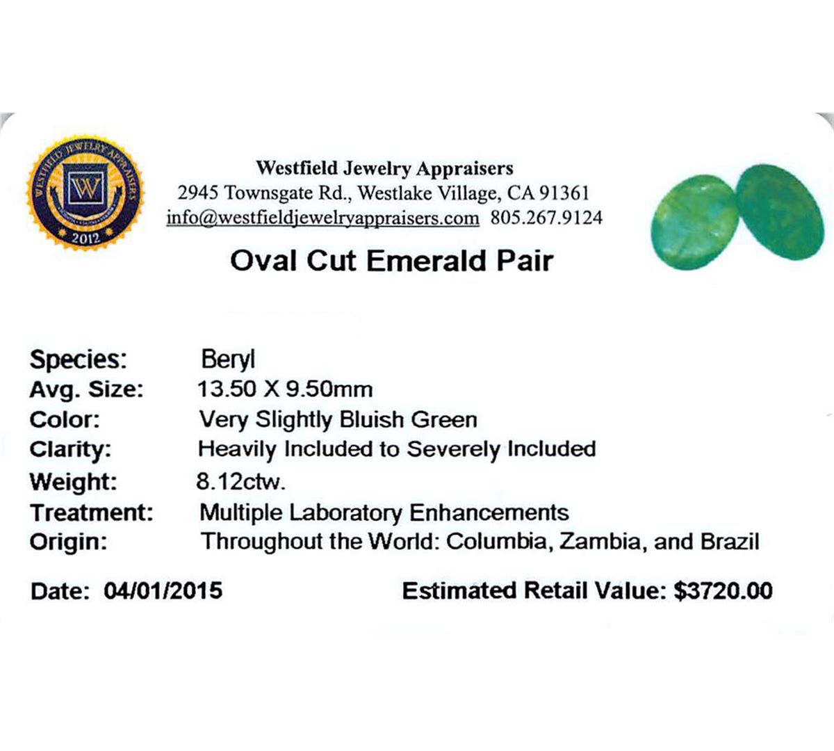 Two oval mixed cut natural emeralds exact total weight 8.12ct., clarity is heavily included, type III, medium dark, very slightly grayish, very slightly bluish green color, (GIA vslbG 6/3), cut is good. Westfield Appraised at $3,720.00.