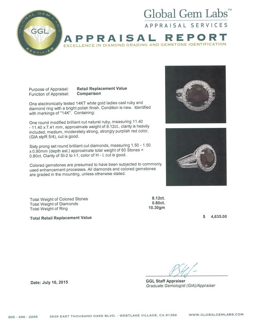 One electronically tested 14KT white gold ladies cast ruby and diamond ring with a bright polish finish. Identified with markings of "14K". Condition is new. Containing: One round modified brilliant cut natural ruby, measuring 11.40 - 11.40 x 7.41 mm, approximate weight of 8.12ct., clarity is heavily included, medium, moderately strong, strongly purplish red color, (GIA stpR 5/4), cut is good. Sixty prong set round brilliant cut diamonds, measuring 1.50 - 1.50 x 0.90mm (depth est.) approximate total weight of 60 Stones = 0.80ct. Clarity: SI-2 to I-1. Color: H - I, Cut is Good. Colored gemstones are presumed to have been subjected to commonly used enhancement processes. All diamonds and colored gemstones are graded in the mounting, unless otherwise stated. Total Weight of Colored Stones 8.12ct. Total Weight of Diamonds 0.80ct. Total Weight of Ring 10.30 grams. GGL Appraised at $4,635.00.