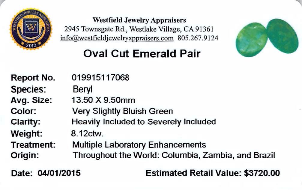 Two oval mixed cut natural emeralds exact total weight 8.12ct., clarity is heavily included, type III, medium dark, very slightly grayish, very slightly bluish green color, (GIA vslbG 6/3), cut is good. Westfield Appraised at $3,720.00.