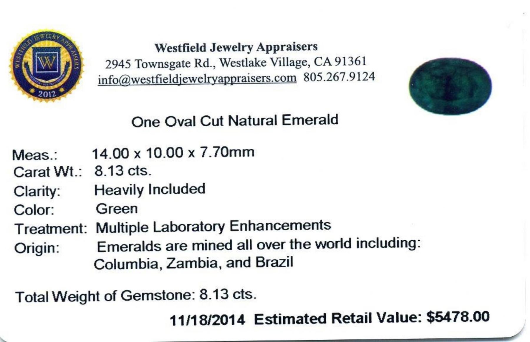 8.13ct. One Oval Cut Natural Emerald Westfield Appraised at $5,478.00.