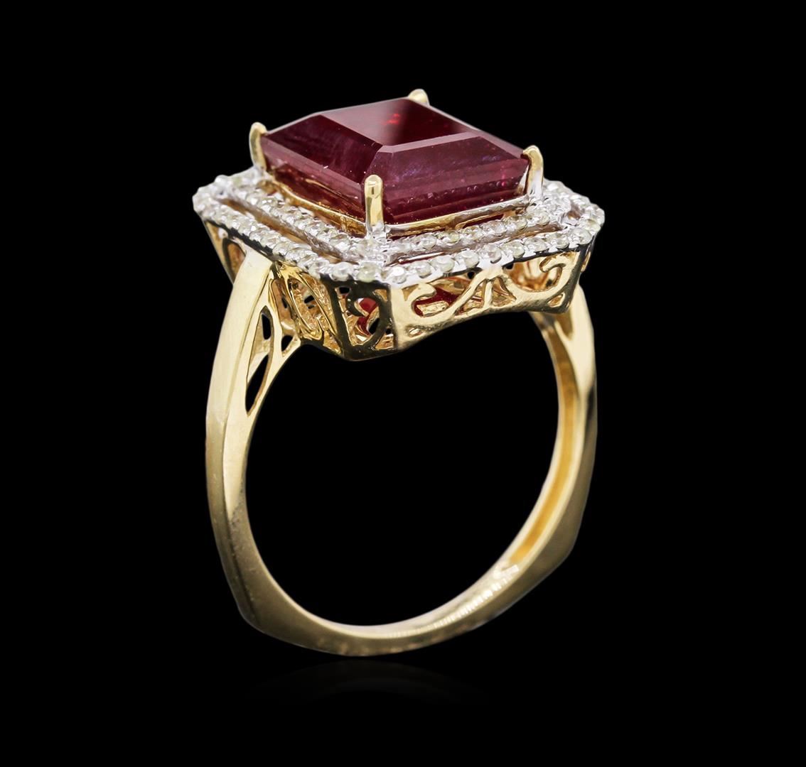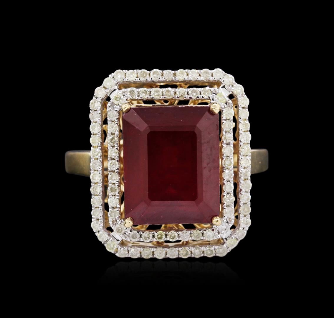 Fourteen karat (14K) yellow gold ruby and diamond ring. An emerald cut ruby corundum gemstone is prong mounted in the center of the ring. Round brilliant cut diamonds accent the ring around the center gemstone and on both sides. The ring is cast stamped " GGA Appraised.