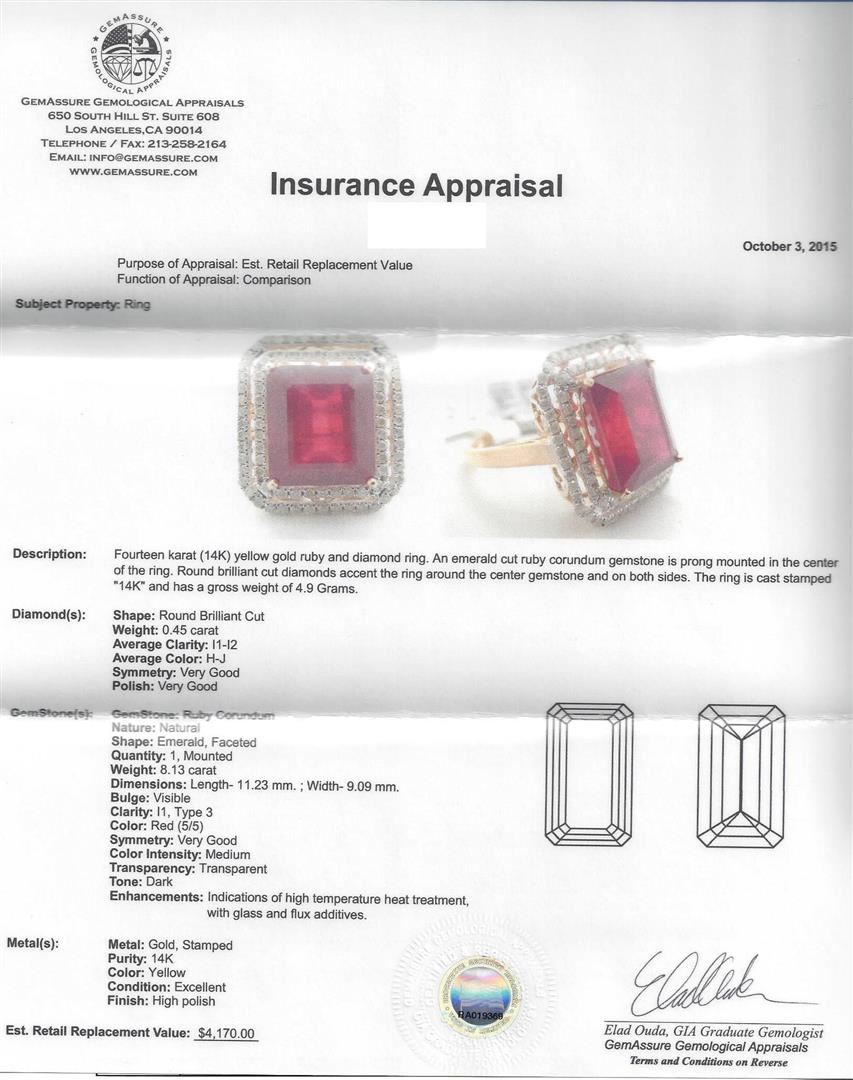 Fourteen karat (14K) yellow gold ruby and diamond ring. An emerald cut ruby corundum gemstone is prong mounted in the center of the ring. Round brilliant cut diamonds accent the ring around the center gemstone and on both sides. The ring is cast stamped "14K" and has a gross weight of 4.9 Grams. Diamond(s): Shape: Round Brilliant Cut. Weight: 0.45 carat. Average Clarity: I1-I2. Average Color: H-J. Symmetry: Very Good. Polish: Very Good. Gemstone(s): GemStone: Ruby Corundum. Nature: Natural. Shape: Emerald, Faceted. Quantity: 1, Mounted. Weight: 8.13 carat. Dimensions: Length-11.23 mm. ; Width- 9.09 mm. Bulge: Visible. Clarity: I1, Type 3. Color: Red (5/5). Symmetry: Very Good. Color Intensity: Medium. Transparency: Transparent. Tone: Dark. Enhancements: Indications of high temperature heat treatment, with glass and flux additives. Metal(s): Metal: Gold, Stamped. Purity: 14K. Color: Yellow. Condition: Excellent. Finish: High polish. GGA Appraised.