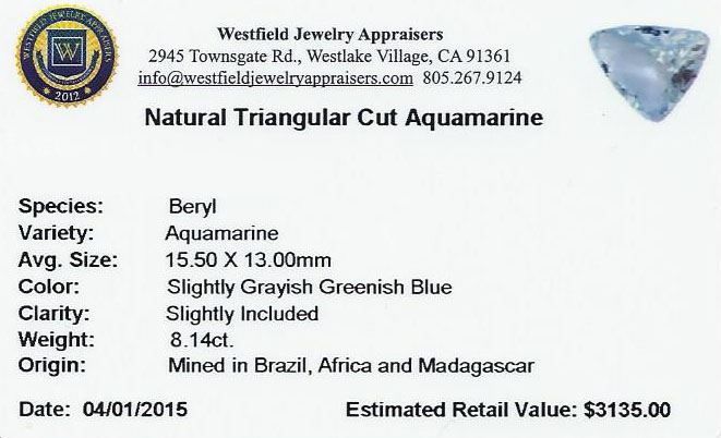 One triangle cut natural aquamarine exact weight 8.14ct., clarity is slightly included, type I, medium, very slightly grayish, very slightly greenish blue color, (GIA vslgB 5/3), cut is good. Westfield Appraised at $3,135.00.