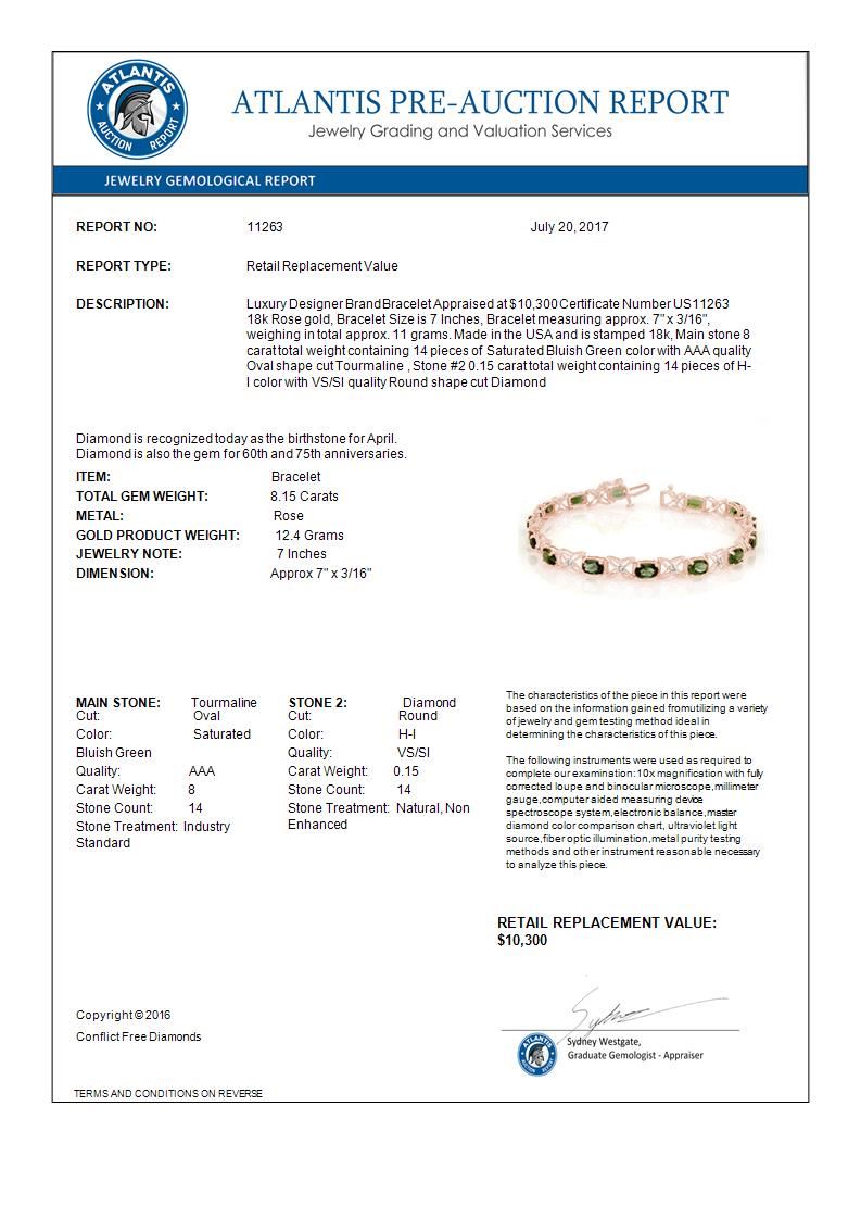 8.15 CTW Green Tourmaline & Diamond Bracelet 18K Rose Gold ---- Luxury Designer Brand Bracelet Appraised Retail Price at $10,300 ---- SKU Number US11263 18k Rose gold Bracelet Size is 7 Inches, Bracelet measuring approx. 7" x 3/16", weighing in total approx. 11 grams. Made in the USA and is stamped 18k, Main stone 8 carat total weight containing 14 pieces of Saturated Bluish Green color with AAA quality Oval shape cut Tourmaline , Stone #2 0.15 carat total weight containing 14 pieces of H-I color with VS/SI quality Round shape cut