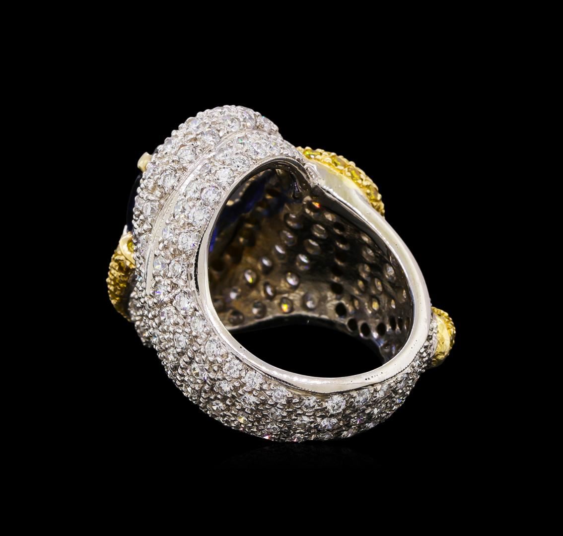 One electronically tested 18KT white gold ladies cast sapphire and diamond ring. The featured sapphire is set within a wrapping diamond set curvature accented by a curving ribbon of yellow diamonds supported by tapering diamond set shoulders, completed by a seven millimeter wide diamond studded band. Bright and patterned finish with yellow gold accents. Condition is good. Containing: One prong set oval mixed cut natural blue sapphire, measuring 13.50 x 10.00. x 7.20mm, approximate weight of 8.16ct., clarity is slightly included, type II, dark, moderately strong, blue color, (GIA B 7/4), cut is good. Transmitting light with a minimum of distortion, transparent. Naturally occurring internal & external characteristics are present. Graded in the setting. Ninety-Three prong set round brilliant cut diamonds, measuring 1.70 - 1.20 x 0.87mm (depth est.) approximate total weight of 93 Stones = 1.10ct. Indications of laboratory irradiated enhanced color. Color grade is an average for the group. Graded in the setting. Clarity: SI-1 to I-1 One Hundred Fifty-Four prong set round brilliant cut diamonds, measuring 1.70 - 1.40 x 0.93mm (depth est.) approximate total weight of 154 Stones = 2.19ct. Graded in the setting. Clarity: VS-1 to SI-1 . Color: F - H. Total Weight of Colored Stones 8.16ct.. Total Weight of Diamonds 3.29ct.. Total Weight of Ring 16.64gm. AIG Appraised at $33,860.00.