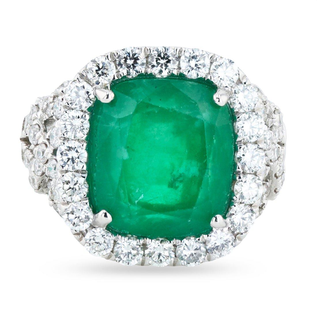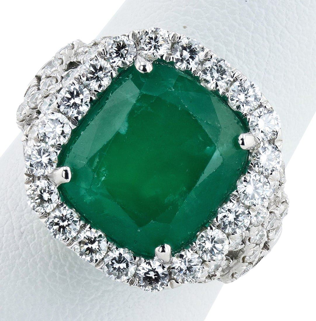 One polished, stamped, and tested platinum ring marked Sheffield and Sons. The ring is mounted with: 1 genuine GIA certified emerald center tone weighing 8.16 carats, and 62 genuine round diamonds weighingapproximately 1.57 carats. This item weighs 11.2 grams, condition is new, excellent workmanship. #MAIN GEMSTONE# GIA Report No. 2225416744 Species: Natural Beryl Variety: Emerald Shape: Cushion Cutting Style:Brillant Cut Crown, Step Cut Pavilion Measurements: 11.99 x 10.66 x 8.32mm Weight: 8.16 carats Color: Green Transparency: Transparent to Semi Transparent Treament: Clarity Enhanced (F2) Refractive Index: 1.564 - 1.595 DR Birefringence: 0.005 to 0.009 Hardness: 7.5 - 8 #ADJACENT GEMSTONES ON RING# Identity: Natural Diamond Shape: Round Cutting Style: Brillant Cut Quantity: 62 Diamonds Measurements: 1.5 - 2.1mm TotalWeight: 1.57 carats Color Grade: F - G Clarity Grade: VS1 - SI1 Refractive Index: 2.418 Hardness: 10 EMERALD WEIGHT: 8.16ct TOTAL DIAMOND WEIGHT: 1.57 cts WEIGHT OF ITEM: 11.2 grams METAL: Platinum