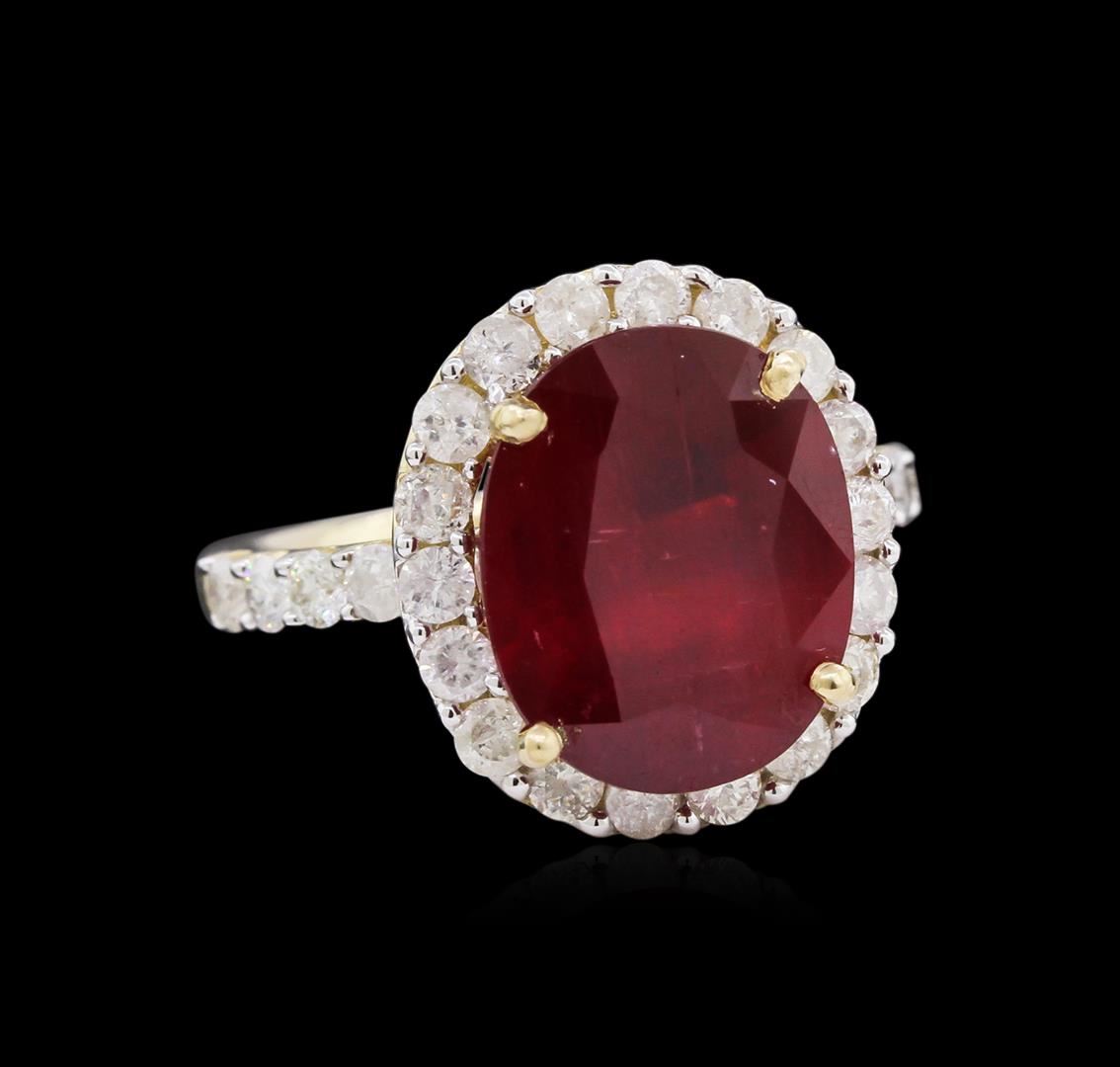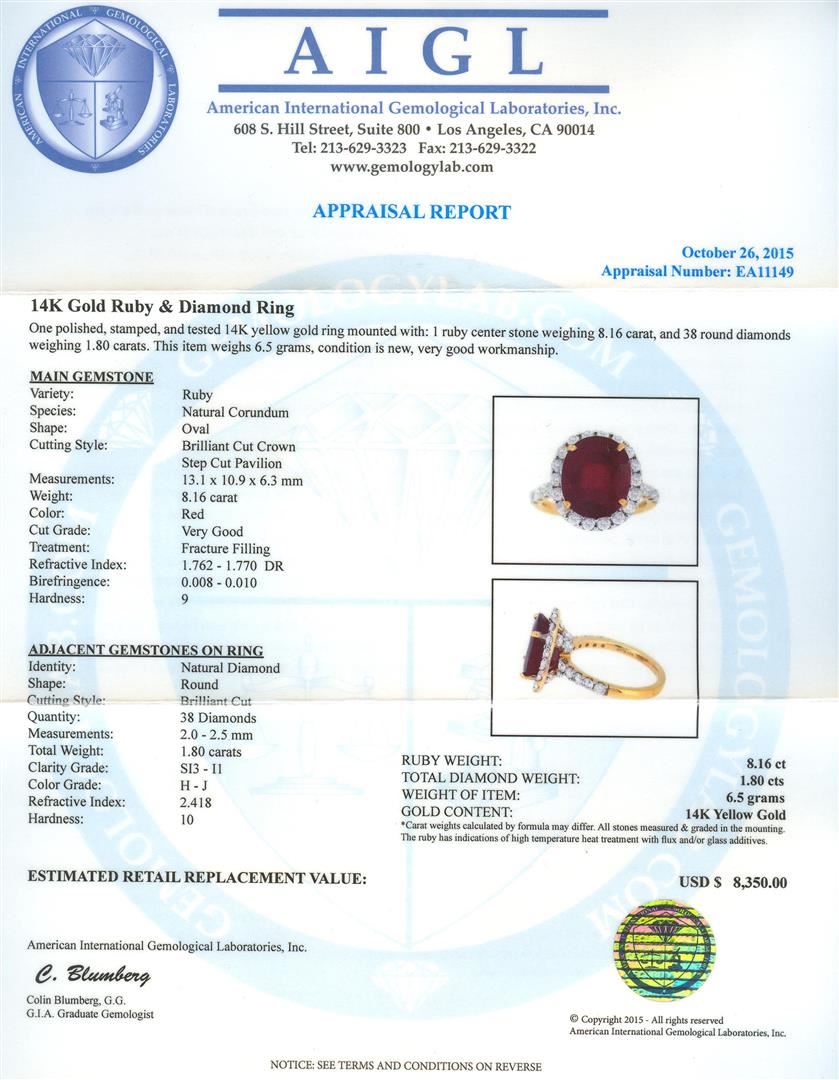 One polished, stamped, and tested 14KT yellow gold ring mounted with: 1 ruby center stone weighing 8.16 carats, and 38 round diamonds weighing 1.80 carats. This item weighs 6.50 grams, condition is new, very good workmanship. Main Gemstone: Variety: Ruby. Species: Natural corundum. Shape: Oval. Cutting Style: Brilliant cut crown; step cut pavilion. Measurements: 13.1 x 10.9 x 6.3 mm. Weight: 8.16 carat. Color: Red. Cut Grade: Very good. Refractive Index: 1.762 - 1.770 DR. Birefringence: 0.008-0.010. Hardness: 9. Adjacent Gemstones on Ring: Identity: Natural diamond. Shape: Round. Cutting Style: Brilliant cut. Quantity: 38 diamonds. Measurements: 2.0 - 2.5 mm. Total Weight: 1.80 carats. Clarity Grade: SI3-I1. Color Grade: H-J. Refractive Index: 2.418. Hardness: 10. Ruby Weight: 8.16ct. Total Diamond Weight: 1.80ct. Weight of Item: 6.50 grams. Gold Content: 14K Yellow Gold. AIGL Appraised at $8,350.00.