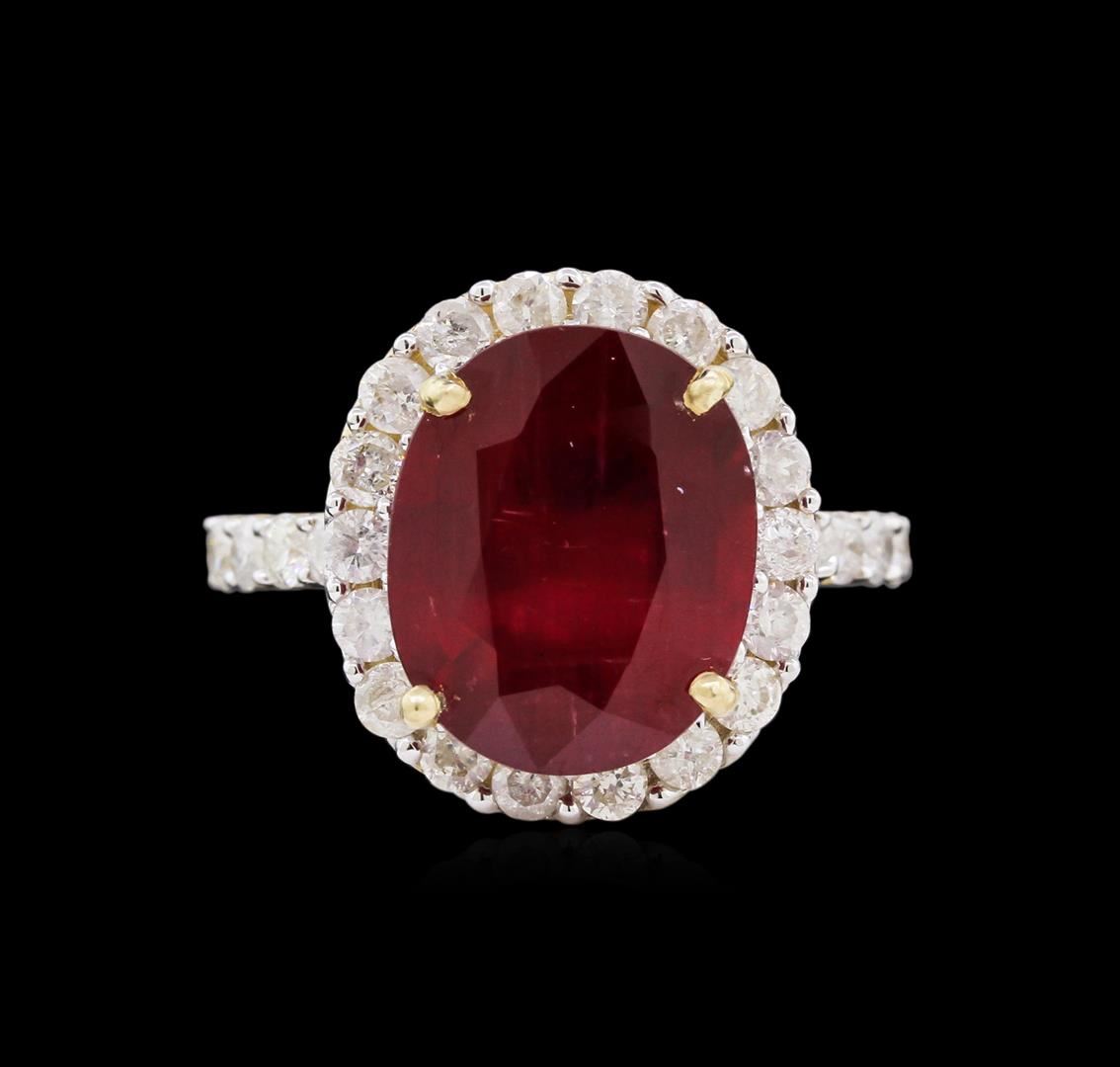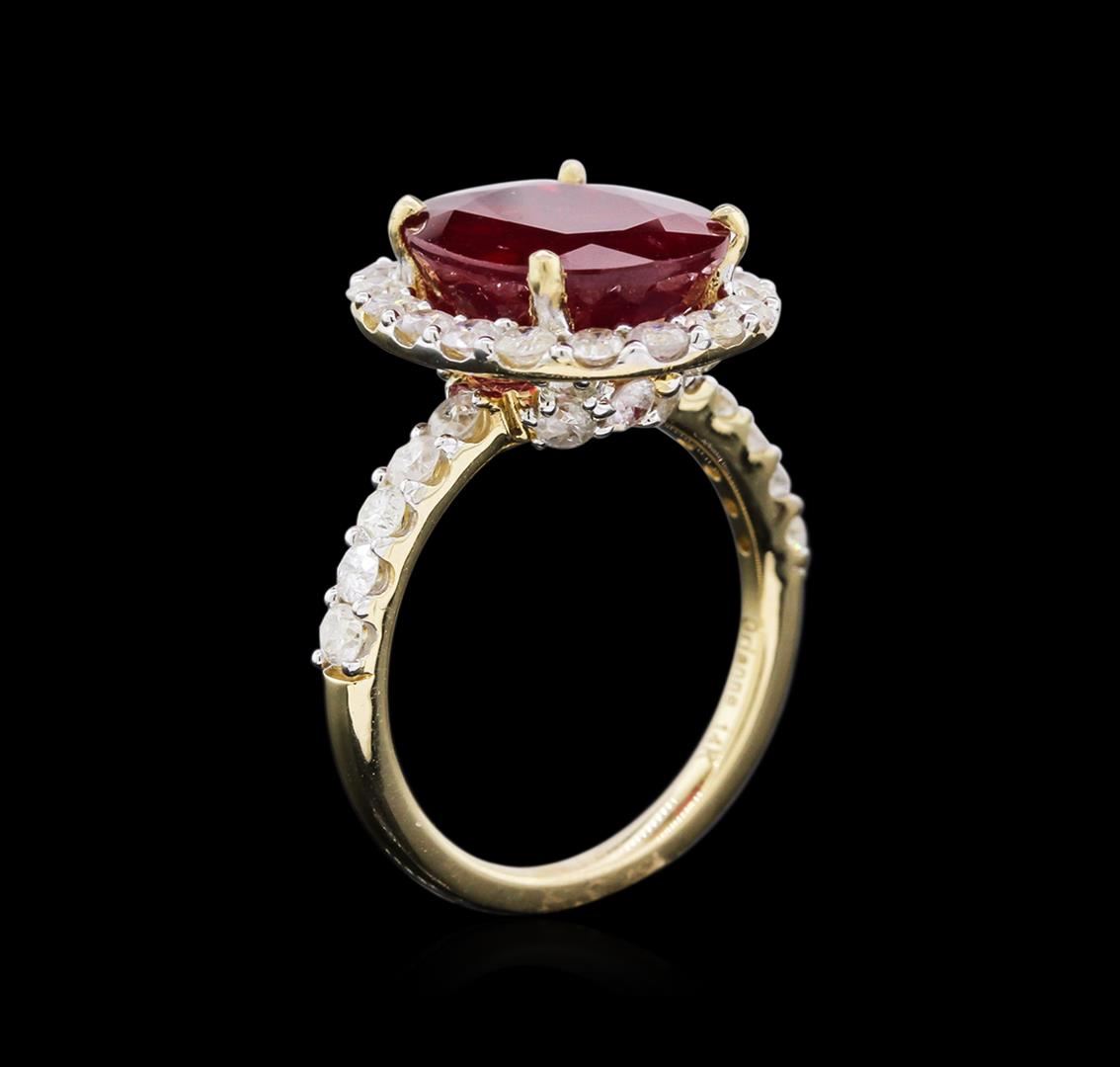 One polished, stamped, and tested 14KT yellow gold ring mounted with: 1 ruby center stone weighing 8.16 carats, and 38 round diamonds weighing 1.80 carats. This item weighs 6.50 grams, condition is new, very good workmanship. Main Gemstone: Variety: Ruby. Species: Natural corundum. Shape: Oval. Cutting Style: Brilliant cut crown; step cut pavilion. Measurements: 13.1 x 10.9 x 6.3 mm. Weight: 8.16 carat. Color: Red. Cut Grade: Very good. Refractive Index: 1.762 - 1.770 DR. Birefringence: 0.008-0.010. Hardness: 9. Adjacent Gemstones on Ring: Identity: Natural diamond. Shape: Round. Cutting Style: Brilliant cut. Quantity: 38 diamonds. Measurements: 2.0 - 2.5 mm. Total Weight: 1.80 carats. Clarity Grade: SI3-I1. Color Grade: H-J. Refractive Index: 2.418. Hardness: 10. Ruby Weight: 8.16ct. Total Diamond Weight: 1.80ct. Weight of Item: 6.50 grams. Gold Content: 14K Yellow Gold. AIGL Appraised at $8,350.00.