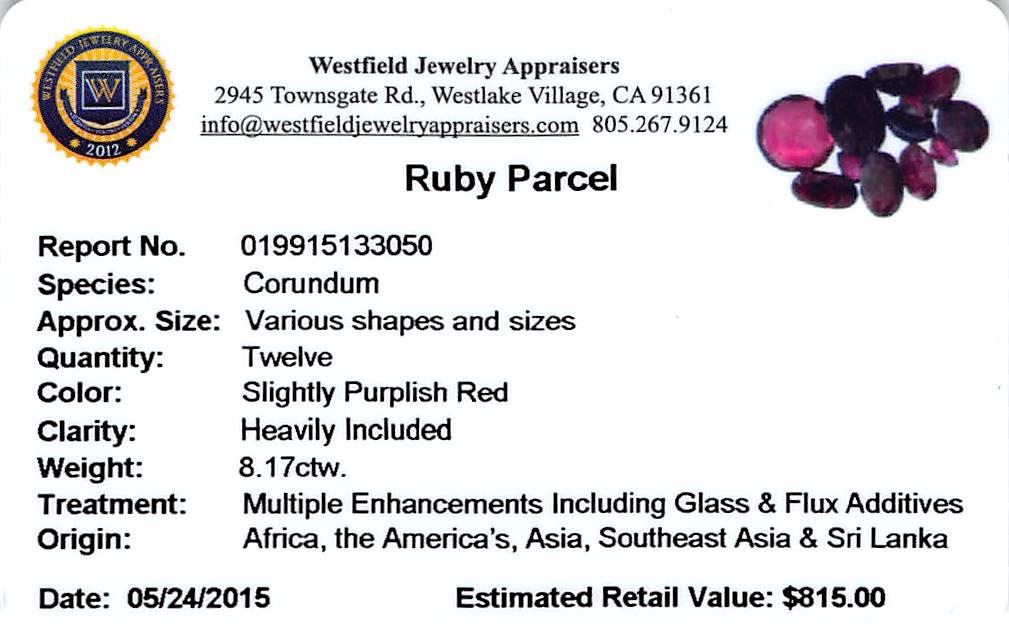 Twelve various shapes & sizes cut natural rubies exact total weight 8.17ct., type II Transmitting light somewhat diffusely, transparent to translucent. Naturally occurring internal & external characteristics are present. Indications of laboratory high temperature heat treatment, with glass & flux additives. Ruby has a low tolerance to rhodium plating, repolishing the surface, & ultrasonic cleaning. Westfield Appraised at $815.00.