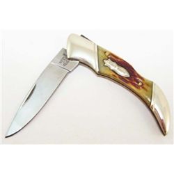 Amber jigged bone handles. 3" closed. Stainless drop point blade. Nickel silver bolsters and inlay shield.