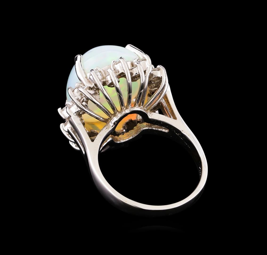 One electronically tested 14KT white gold lady's cast fashion ring with a basket halo with a bright polish finish. The featured lady's ring has a shank measuring 2.55 millimeters wide. Identified with markings of "14K". Condition is new, good workmanship. Containing: One crystal opal that is cut in a oval shaped cabochon and is prong set, measuring 17.40 mm long x 13.25 mm wide, and 8.14 mm thick and the approximate weight is 8.18 carats. The opal has a bright, multicolor play of color (fire) in a rolling flashfire pattern; a high dome; a good cut; slightly included; consistent in its brightness and pattern; and is not directional. Graded in the setting. Twenty-Four prong set round brilliant cut diamonds, measuring 2.00 - 1.90 x 1.21mm (depth est.) approximate total weight of 24 Stones = 0.67ct. Graded in the setting. Clarity: SI-1 to SI-2. Color: G - Good. Total Weight of Diamonds 0.67ct. Total Weight of Opals 8.18ct. Total Weight of Ring 8.80gm. GAS Appraised.