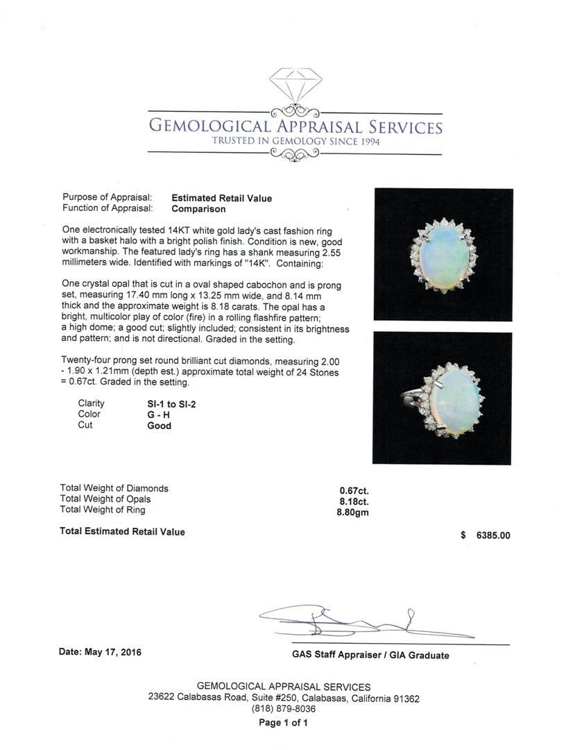 One electronically tested 14KT white gold lady's cast fashion ring with a basket halo with a bright polish finish. The featured lady's ring has a shank measuring 2.55 millimeters wide. Identified with markings of "14K". Condition is new, good workmanship. Containing: One crystal opal that is cut in a oval shaped cabochon and is prong set, measuring 17.40 mm long x 13.25 mm wide, and 8.14 mm thick and the approximate weight is 8.18 carats. The opal has a bright, multicolor play of color (fire) in a rolling flashfire pattern; a high dome; a good cut; slightly included; consistent in its brightness and pattern; and is not directional. Graded in the setting. Twenty-Four prong set round brilliant cut diamonds, measuring 2.00 - 1.90 x 1.21mm (depth est.) approximate total weight of 24 Stones = 0.67ct. Graded in the setting. Clarity: SI-1 to SI-2. Color: G - Good. Total Weight of Diamonds 0.67ct. Total Weight of Opals 8.18ct. Total Weight of Ring 8.80gm. GAS Appraised.