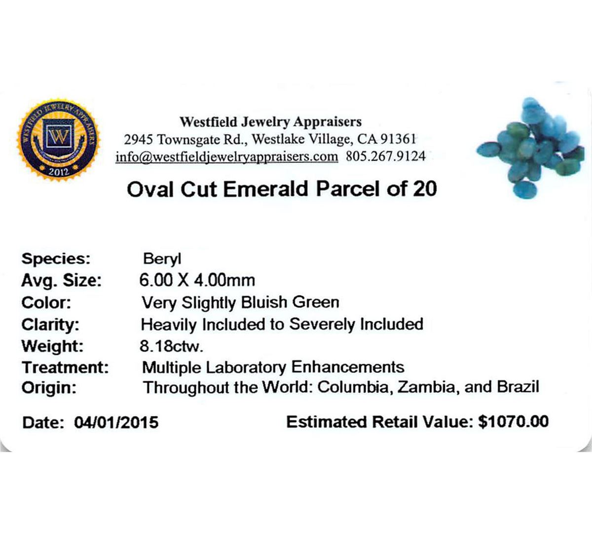 Twenty oval mixed cut natural emeralds exact total weight 8.18ct., clarity is heavily included, type III, medium, very slightly grayish, very slightly bluish green color, (GIA vslbG 5/3), cut is good. Westfield Appraised at $1,070.00.
