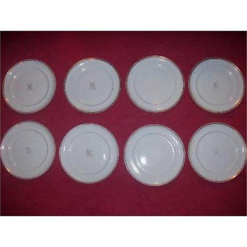 A set of eight 18th century Chinese Export Dinner plates Circa . 1780-1800. From a Baltimore, Maryland estate. Chinese Export Dinner Plates measuring 10" in diameter with a big gold gilt monogram in the center with initials. Made for the American Market. Each plate has gold gilt wear and seven of the eight plates have small rim chips. It is very hard to find a set of eight 18th century Chinese export dinner plates. They would look good in a Classical Federal or Empire interior.
