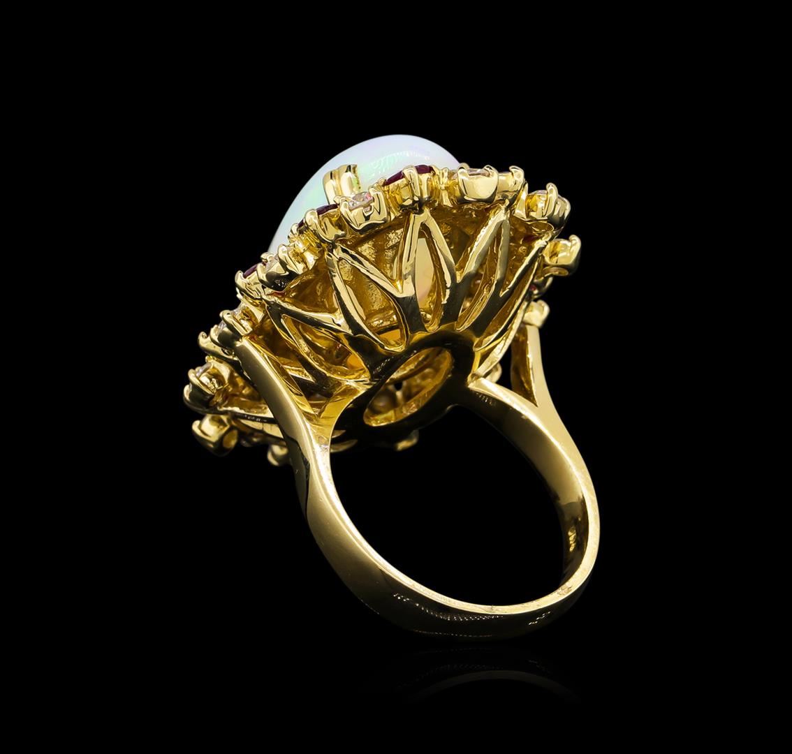 One electronically tested 14KT yellow gold ladies cast opal, ruby and diamond ring with a bright polish finish. The featured opal is set within a stylized ruby and diamond floret supported by a lattice under gallery, completed by a four millimeter wide band. Identified with markings of "K14". Condition is new, good workmanship. Containing: One semi crystal opal that is cut in a oval shaped cabochon and is prong set, measuring 21.00 mm long x 12.00 mm wide, and 7.00 mm thick and the approximate weight is 8.19 carats. The opal has a bright, green-blue play of color (fire) in a flashfire pattern; a medium dome; a good cut; no inclusions; consistent in its brightness and pattern; and is slightly directional. Graded in the setting. Twelve prong set round mixed cut natural rubies approximate total weight of 1.65ct., clarity is moderately included, type II, medium dark, very slightly brownish, red color, (GIA R 6/3), cut is good. Transmitting light somewhat diffusely, transparent to translucent. Naturally occurring internal & external characteristics are present. Color grade is an average for the group. Graded in the setting. Fifty-Four prong set round brilliant cut diamonds approximate total weight of 54 Stones = 1.62ct. Graded in the setting. Clarity: SI-1 to I-1. Color: D - F. Total Weight of Colored Stones 1.65ct. Total Weight of Diamonds 1.62ct. Total Weight of Opals 8.19ct. Total Weight of Ring 15.88gm. AIG Appraised at $9,720.00.