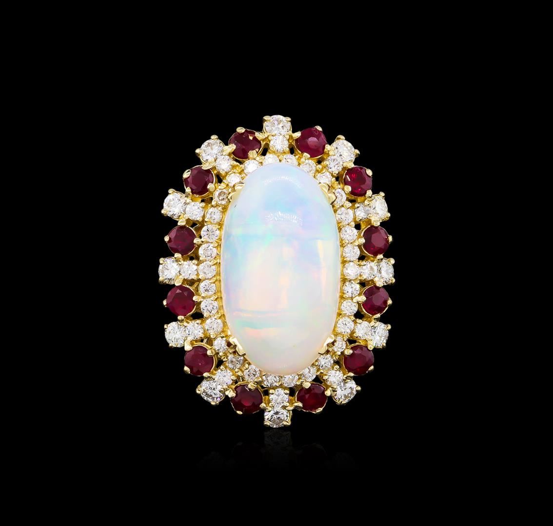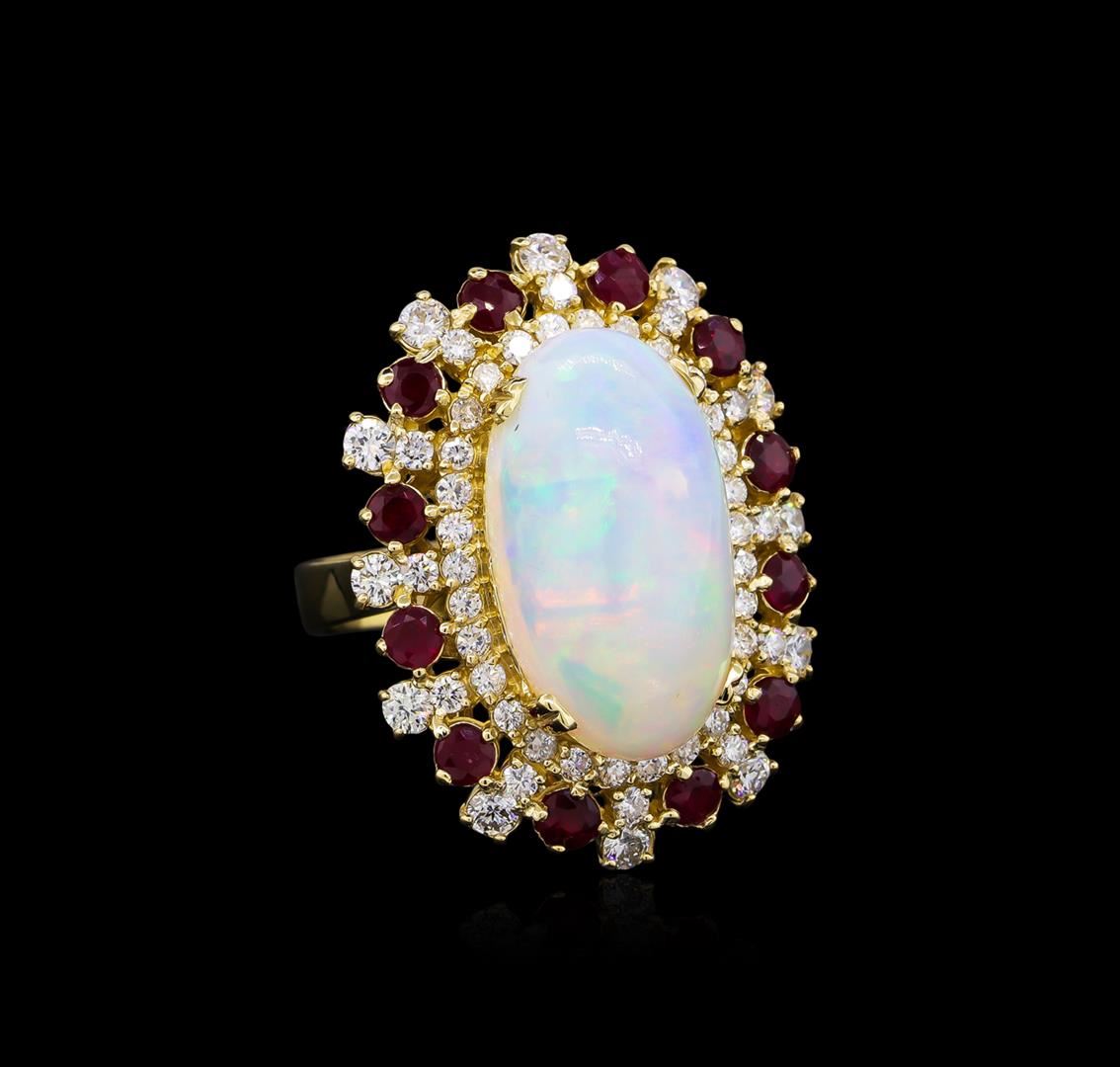 One electronically tested 14KT yellow gold ladies cast opal, ruby and diamond ring with a bright polish finish. The featured opal is set within a stylized ruby and diamond floret supported by a lattice under gallery, completed by a four millimeter wide band. Identified with markings of "K14". Condition is new, good workmanship. Containing: One semi crystal opal that is cut in a oval shaped cabochon and is prong set, measuring 21.00 mm long x 12.00 mm wide, and 7.00 mm thick and the approximate weight is 8.19 carats. The opal has a bright, green-blue play of color (fire) in a flashfire pattern; a medium dome; a good cut; no inclusions; consistent in its brightness and pattern; and is slightly directional. Graded in the setting. Twelve prong set round mixed cut natural rubies approximate total weight of 1.65ct., clarity is moderately included, type II, medium dark, very slightly brownish, red color, (GIA R 6/3), cut is good. Transmitting light somewhat diffusely, transparent to translucent. Naturally occurring internal & external characteristics are present. Color grade is an average for the group. Graded in the setting. Fifty-Four prong set round brilliant cut diamonds approximate total weight of 54 Stones = 1.62ct. Graded in the setting. Clarity: SI-1 to I-1. Color: D - F. Total Weight of Colored Stones 1.65ct. Total Weight of Diamonds 1.62ct. Total Weight of Opals 8.19ct. Total Weight of Ring 15.88gm. AIG Appraised at $9,720.00.