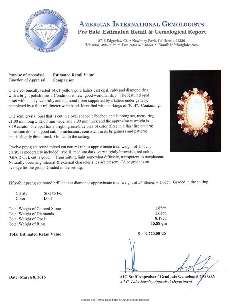 One electronically tested 14KT yellow gold ladies cast opal, ruby and diamond ring with a bright polish finish. The featured opal is set within a stylized ruby and diamond floret supported by a lattice under gallery, completed by a four millimeter wide band. Identified with markings of "K14". Condition is new, good workmanship. Containing: One semi crystal opal that is cut in a oval shaped cabochon and is prong set, measuring 21.00 mm long x 12.00 mm wide, and 7.00 mm thick and the approximate weight is 8.19 carats. The opal has a bright, green-blue play of color (fire) in a flashfire pattern; a medium dome; a good cut; no inclusions; consistent in its brightness and pattern; and is slightly directional. Graded in the setting. Twelve prong set round mixed cut natural rubies approximate total weight of 1.65ct., clarity is moderately included, type II, medium dark, very slightly brownish, red color, (GIA R 6/3), cut is good. Transmitting light somewhat diffusely, transparent to translucent. Naturally occurring internal & external characteristics are present. Color grade is an average for the group. Graded in the setting. Fifty-Four prong set round brilliant cut diamonds approximate total weight of 54 Stones = 1.62ct. Graded in the setting. Clarity: SI-1 to I-1. Color: D - F. Total Weight of Colored Stones 1.65ct. Total Weight of Diamonds 1.62ct. Total Weight of Opals 8.19ct. Total Weight of Ring 15.88gm. AIG Appraised at $9,720.00.