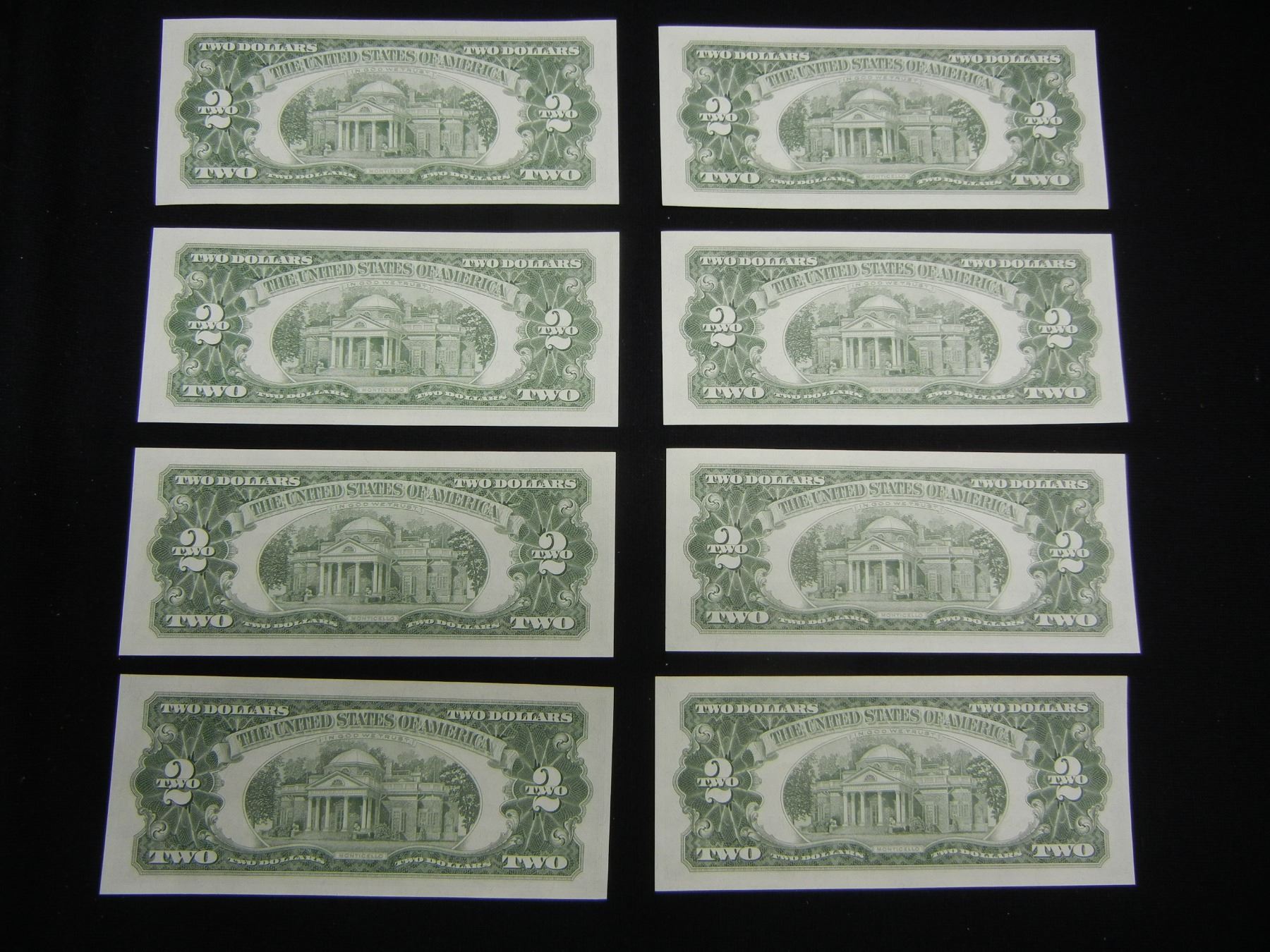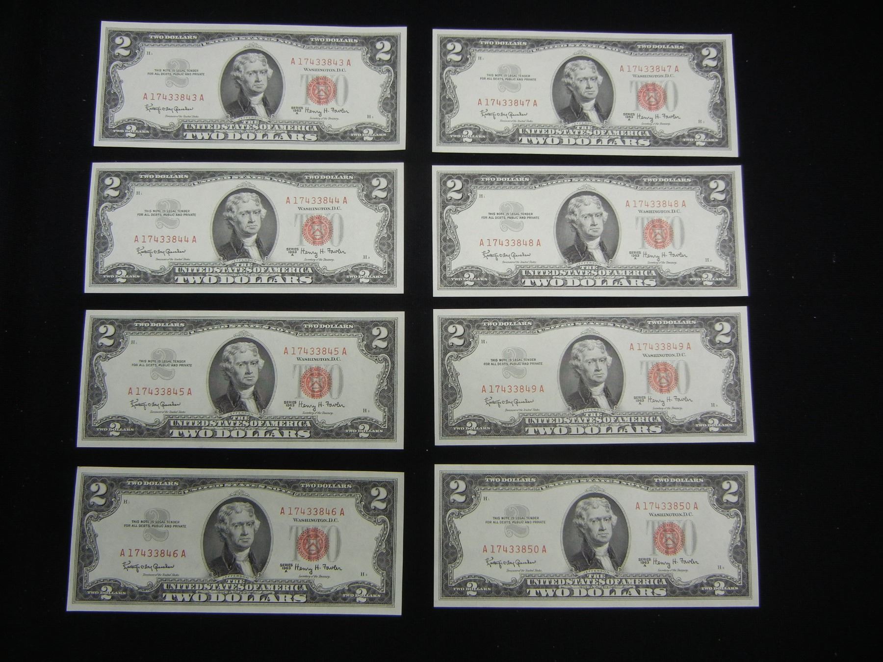 (8) 1963 A Red Seal $2 Notes. Consecutive Serial #s. GEM CU.