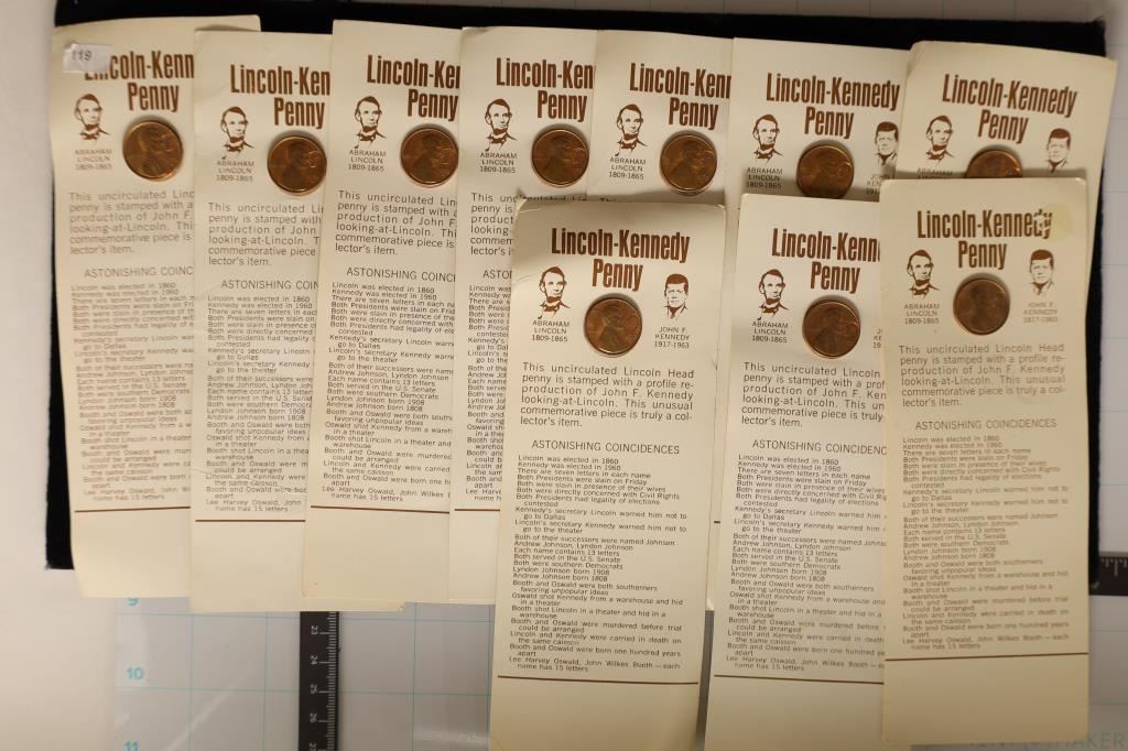 COINCIDENCES LINCOLN CENTS ON INFO CARDS.  KENNEDY'S HEAD IS NEXT TO LINCOLNS HEAD