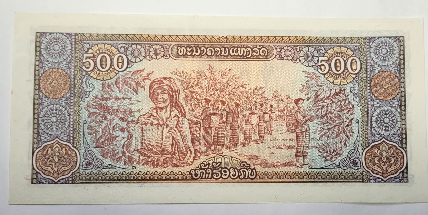 8) 1988 FROM LAOS, 500 KIP UNCIRCULATED BANK-