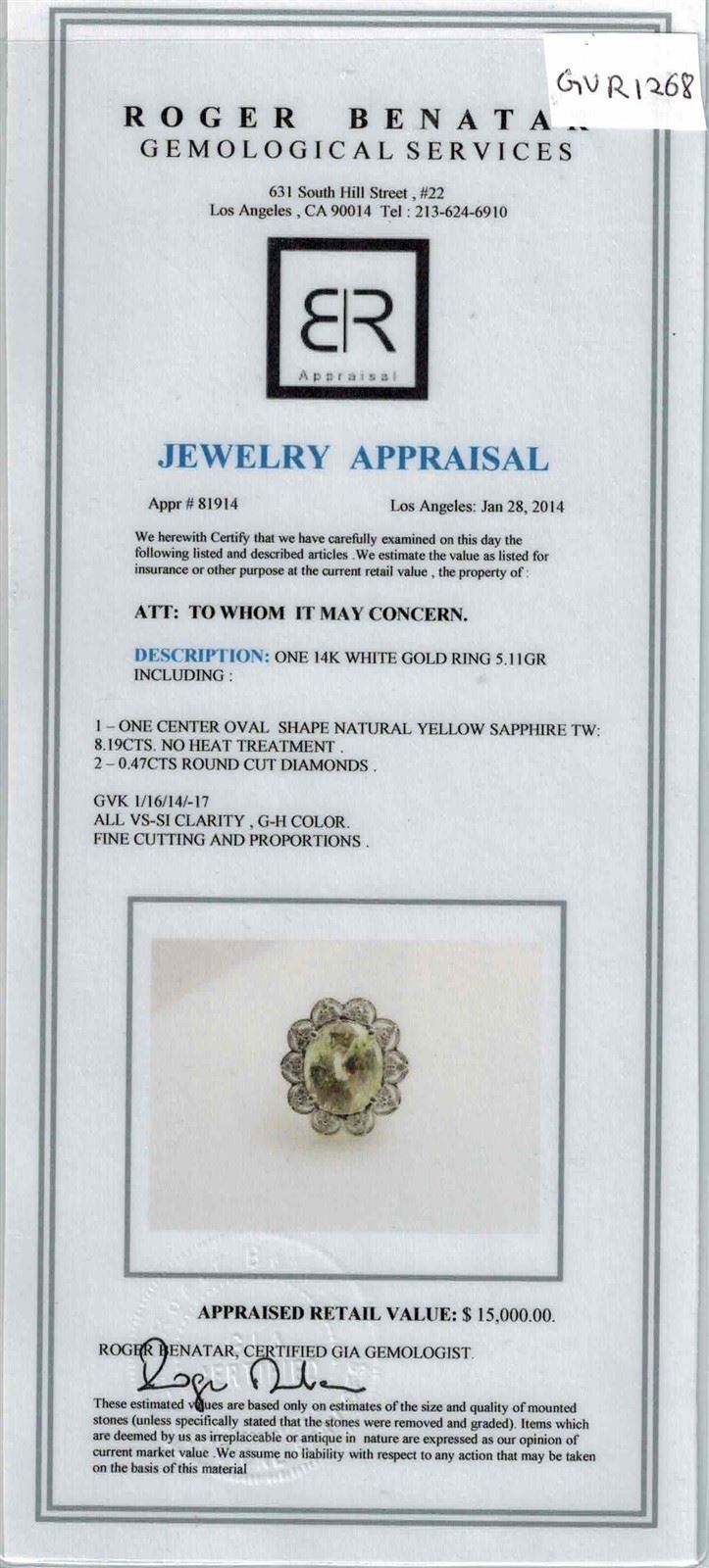 14K WHITE GOLD NATURAL CEYLON YELLOW SAPPHIRE RING :5.11GRAM/NATURAL CEYLON YELLOW SAPPHIRE OVAL :8.19CT/DIAMOND RD :0.47CT/#GVR1268 **Art-fully crafted in 14kt white gold, this delicate style features a dazzling 8.91ct oval shape natural Yellow Sapphire center stone. Yellow Sapphire has long been known as a stone of prosperity. Framed with shimmering 0.47ct round cut Diamonds in a flower motif, a touch of subtle sparkle adds to its classic beauty. this gorgeous ring is an investment piece and secure purchase.**