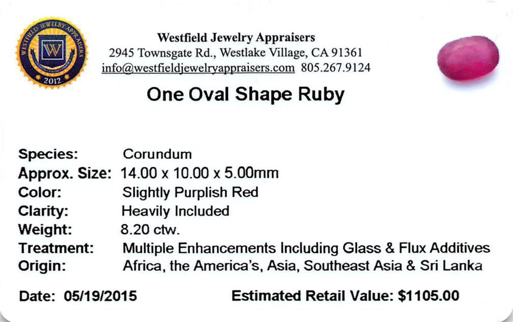 One oval mixed cut natural ruby, measuring 14.00 x 10.00 x 5.00mm, exact weight 8.20ct., clarity is heavily included, type II, medium dark, very slightly brownish, slightly purplish red color, (GIA slpR 6/3), cut is good. Transmitting light somewhat diffusely, translucent. Naturally occurring internal & external characteristics are present. Indications of laboratory high temperature heat treatment, with glass & flux additives. Ruby has a low tolerance to rhodium plating, repolishing the surface, & ultrasonic cleaning. Westfield Appraised at $1,105.00.