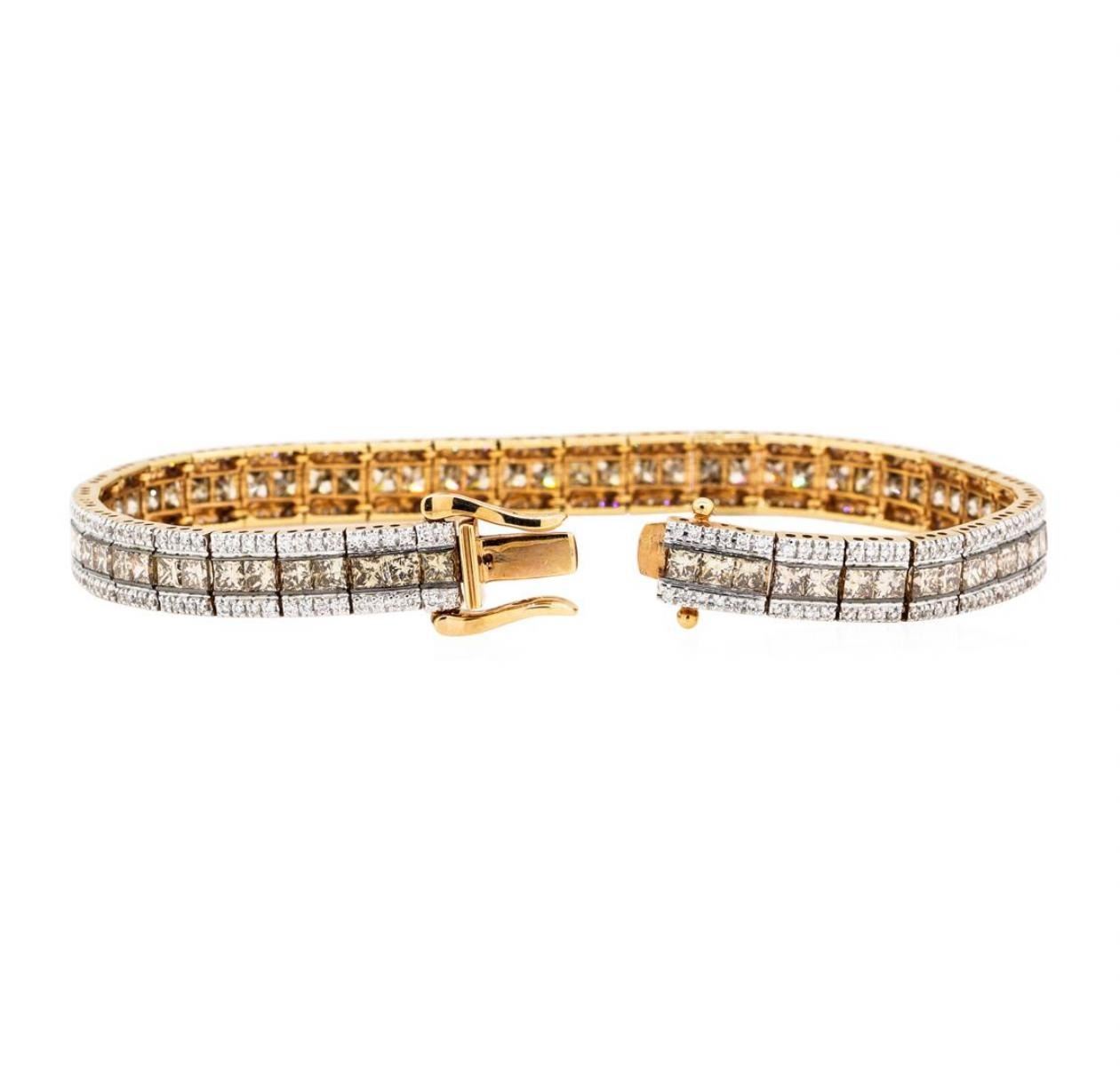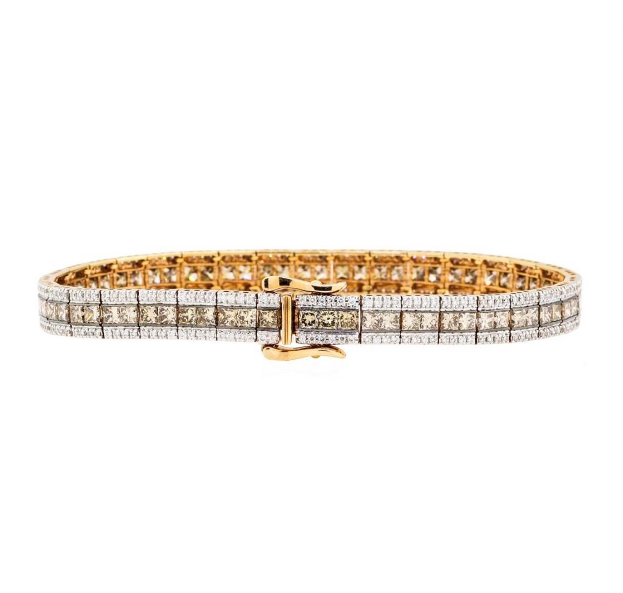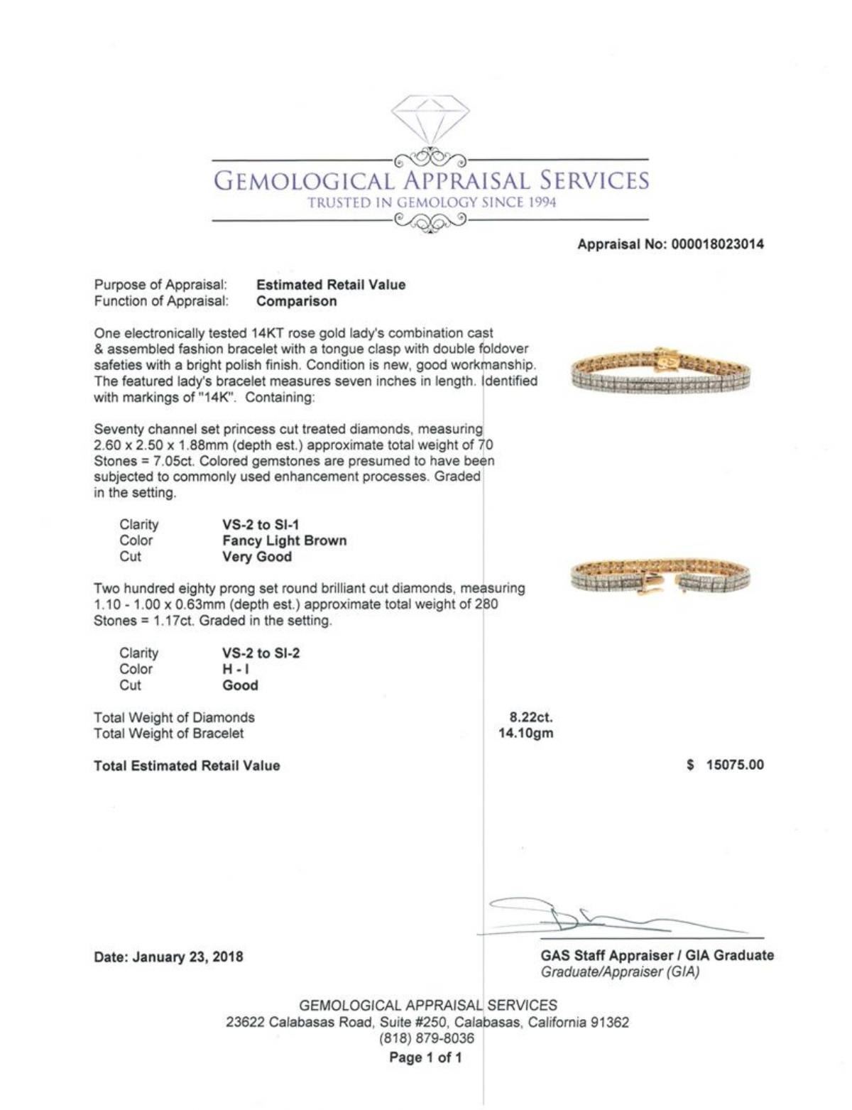 One electronically tested 14KT rose gold lady's combination cast & assembled fashion bracelet with a tongue clasp with double foldover safeties with a bright polish finish. The featured lady's bracelet measures seven inches in length. Identified with markings of '14K'. Condition is new, good workmanship. Containing: Seventy channel set princess cut treated diamonds, measuring 2.60 x 2.50 x 1.88mm (depth est.) approximate total weight of 70 Stones = 7.05ct. Colored gemstones are presumed to have been subjected to commonly used enhancement processes. Graded in the setting. Color Fancy Light Brown Clarity VS-2 to SI-1 Cut Very Good Two Hundred Eighty prong set round brilliant cut diamonds, measuring 1.10 - 1.00 x 0.63mm (depth est.) approximate total weight of 280 Stones = 1.17ct. Graded in the setting. Color H - I Clarity VS-2 to SI-2 Cut Good. Total Weight of Diamonds 8.22ct.. Total Weight of Bracelet 14.10gm GAS Appraised at  $15075.00. GAS Appraised.