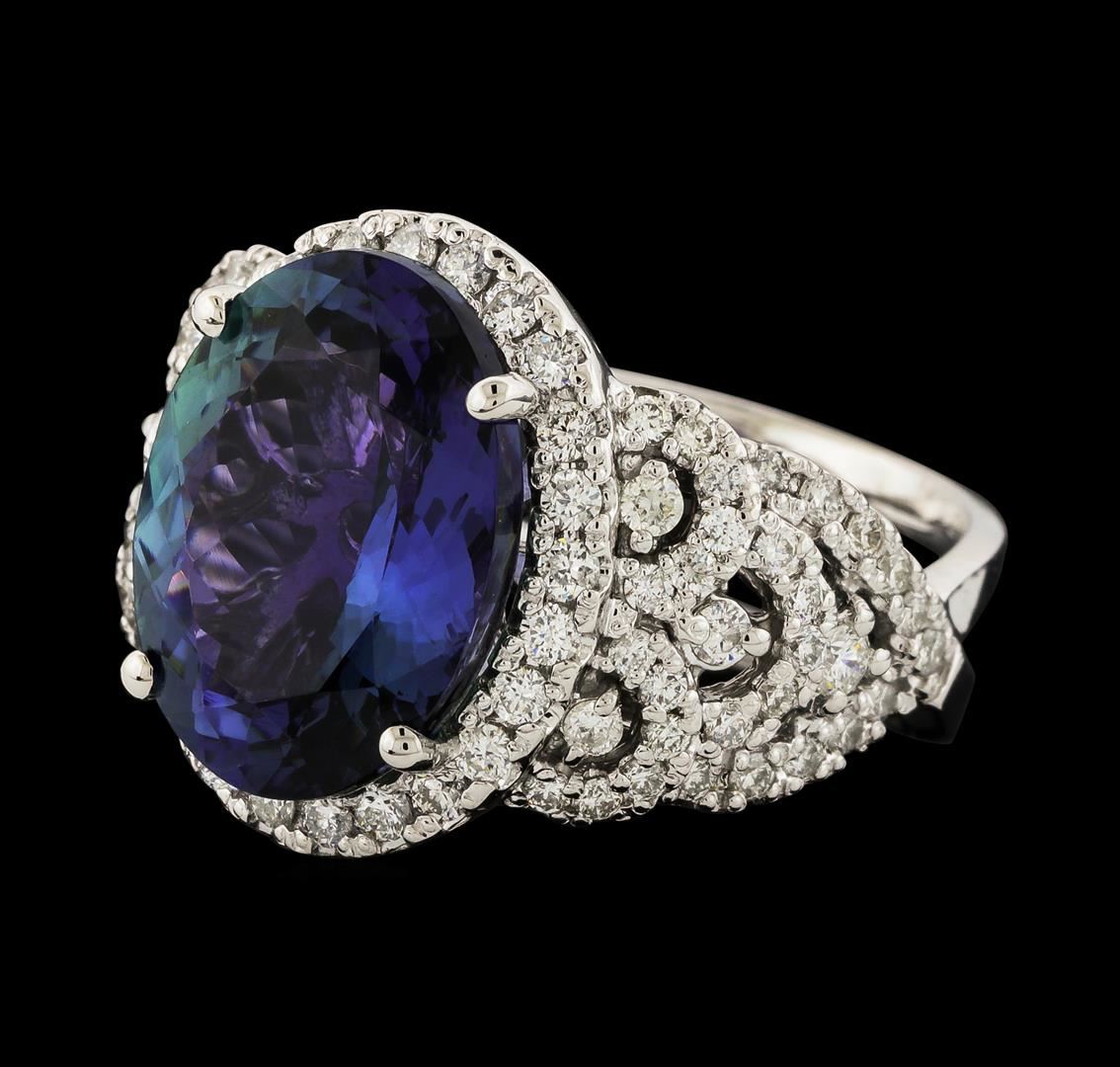 One electronically tested 14KT white gold lady's cast fashion ring with a split cathedral shank with a halo with a bright polish finish. The featured lady's ring has tiered and scalloped diamond encrusted shoulders and a split double shank measuring 7.28 millimeters wide. Identified with markings of 'K14'. Condition is new, good workmanship. Containing: One prong set oval modified brilliant cut natural tanzanite, measuring 14.85 x 11.39 x 6.58mm, (depth est.) 5%. bulge factor, approximate weight of 8.23ct., clarity is eye clean, medium dark, slightly grayish, violet color, (GIA V 6/2), cut is good. Transmitting light with no distortion, transparent. Colored gemstones are presumed to have been subjected to commonly used enhancement processes. Graded in the setting. Two prong set round brilliant cut diamonds, measuring 2.40 - 2.30 x 1.46mm (depth est.) approximate total weight of 2 Stones = 0.10ct. Graded in the setting. Clarity SI-1. Color: G - H Cut Good Thirty prong set round brilliant cut diamonds, measuring 1.70 - 1.60 x 1.02mm (depth est.) approximate total weight of 30 Stones = 0.50ct. Graded in the setting. Clarity SI-1 to SI-2. Color: G - H Cut Good Fifty-Six prong set round brilliant cut diamonds, measuring 1.50 - 1.35 x 0.89mm (depth est.) approximate total weight of 56 Stones = 0.62ct. Graded in the setting. Clarity SI-1 to SI-2. Color: G - H Cut Good. Total Weight of Colored Stones 8.23ct.. Total Weight of Diamonds 1.22ct.. Total Weight of Ring 10.30gm GAS Appraised at $12,275.00.