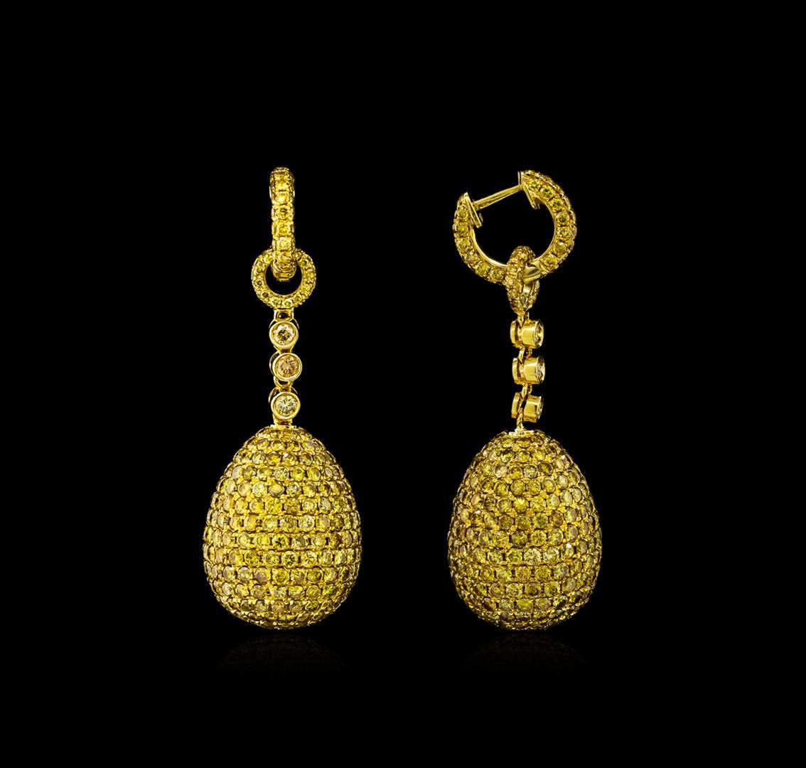 One pair electronically tested 18KT yellow gold ladies cast & assembled diamond dangle earrings. Each earring features a diamond encrusted drop suspended by a diamond ribbon and supported by a removable diamond set hinge snap locking post. Bright polish finish. Identified with markings of "18K". Condition is good. Containing: Six bezel set round brilliant cut diamonds, measuring 2.10 - 2.10 x 1.26mm (depth est.) approximate total weight of 6 Stones = 0.21ct. Indications of laboratory irradiated enhanced color. Color grade is an average for the group. Graded in the setting. Clarity: VS-2 to SI-2 Five Hundred Eighty-Eight prong set round brilliant cut diamonds, measuring 1.60 - 1.40 x 0.90mm (depth est.) approximate total weight of 588 Stones = 7.23ct. Indications of laboratory irradiated enhanced color. Color grade is an average for the group. Graded in the setting. Clarity: SI-2 to I-2 One Hundred Sixty-Four prong set round brilliant cut diamonds, measuring 1.30 - 0.90 x 0.66mm (depth est.) approximate total weight of 164 Stones = 0.80ct. Indications of laboratory irradiated enhanced color. Color grade is an average for the group. Graded in the setting. Clarity: SI-1 to I-1. Total Weight of Diamonds 8.24ct. Total Weight of Earrings 18.00gm. AIG Appraised at $21,085.00.