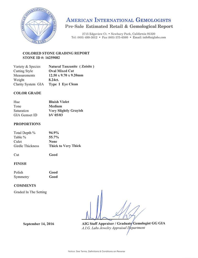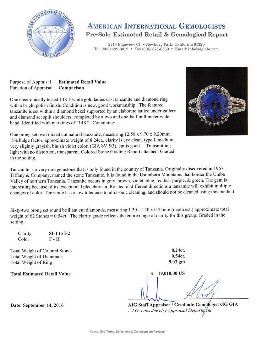 One electronically tested 14KT white gold ladies cast tanzanite and diamond ring with a bright polish finish. The featured tanzanite is set within a diamond bezel supported by an elaborate lattice under gallery and diamond set split shoulders, completed by a two and one-half millimeter wide band. Identified with markings of '14K'. Condition is new, good workmanship. Containing: One prong set oval mixed cut natural tanzanite, measuring 12.50 x 9.70 x 9.20mm, 5%. bulge factor, approximate weight of 8.24ct., clarity is eye clean, type I, medium, very slightly grayish, bluish violet color, (GIA bV 5/3), cut is good. Transmitting light with no distortion, transparent. Colored Stone Grading Report attached. Graded in the setting. Tanzanite is a very rare gemstone that is only found in the country of Tanzania. Originally discovered in 1967. Tiffany & Company, named the stone Tanzanite. It is found in the Usumburu Mountains that border the Umba Valley of northern Tanzania. Tanzanite occurs in gray, brown, violet, blue, reddish-purple, & green. The gem is interesting because of its exceptional pleochroism. Rotated in different directions a tanzanite will exhibit multiple changes of color. Tanzanite has a low tolerance to ultrasonic cleaning, and should not be cleaned using this method. Sixty-Two prong set round brilliant cut diamonds, measuring 1.30 - 1.20 x 0.75mm (depth est.) approximate total weight of 62 Stones = 0.54ct. The clarity grade reflects the entire range of clarity for this group. Graded in the setting. Clarity SI-1 to I-2. Color: F - H. Total Weight of Colored Stones 8.24ct.. Total Weight of Diamonds 0.54ct.. Total Weight of Ring 9.03gm. AIG Appraised at $19,010.00.