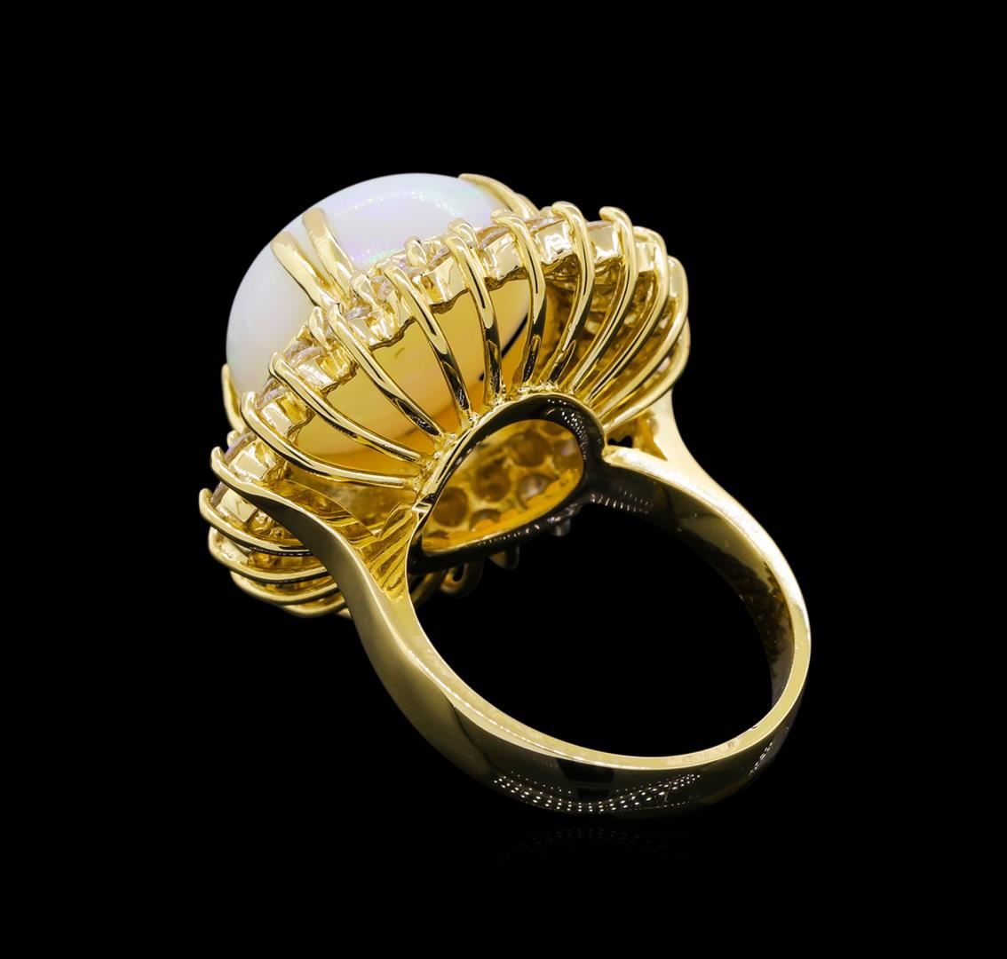 One electronically tested 14KT yellow gold lady's cast fashion ring with a double basket halo with a bright polish finish. The featured lady's ring has a shank measuring 3.68 millimeters in width. Identified with markings of "K14". Condition is new, good workmanship. Containing: One crystal opal that is cut in a round shaped cabochon and is prong set, measuring 15.20 mm long x 14.95 mm wide, and 7.58 mm thick and the approximate weight is 8.25 carats. The opal has a somewhat bright, blue-green play of color (fire) in a rolling flashfire pattern; a medium dome; a cut; no inclusions in its brightness and pattern; and is. Transmitting light somewhat diffusely, transparent to translucent. Graded in the setting. Twenty-Four prong set round brilliant cut diamonds, measuring 2.40 - 2.30 x 1.43mm (depth est.) approximate total weight of 24 Stones = 1.15ct. Graded in the setting. Clarity: SI-1 to SI-2. Color: H - I. Cut Good Twenty-Four prong set round brilliant cut diamonds, measuring 2.10 - 2.00 x 1.27mm (depth est.) approximate total weight of 24 Stones = 0.73ct. Graded in the setting. Clarity: SI-1 to SI-2. Color: H - I. Cut Good. Total Weight of Diamonds 1.88ct. Total Weight of Opals 8.25ct. Total Weight of Ring 12.90gm. GAS Appraised at $8,245.00.